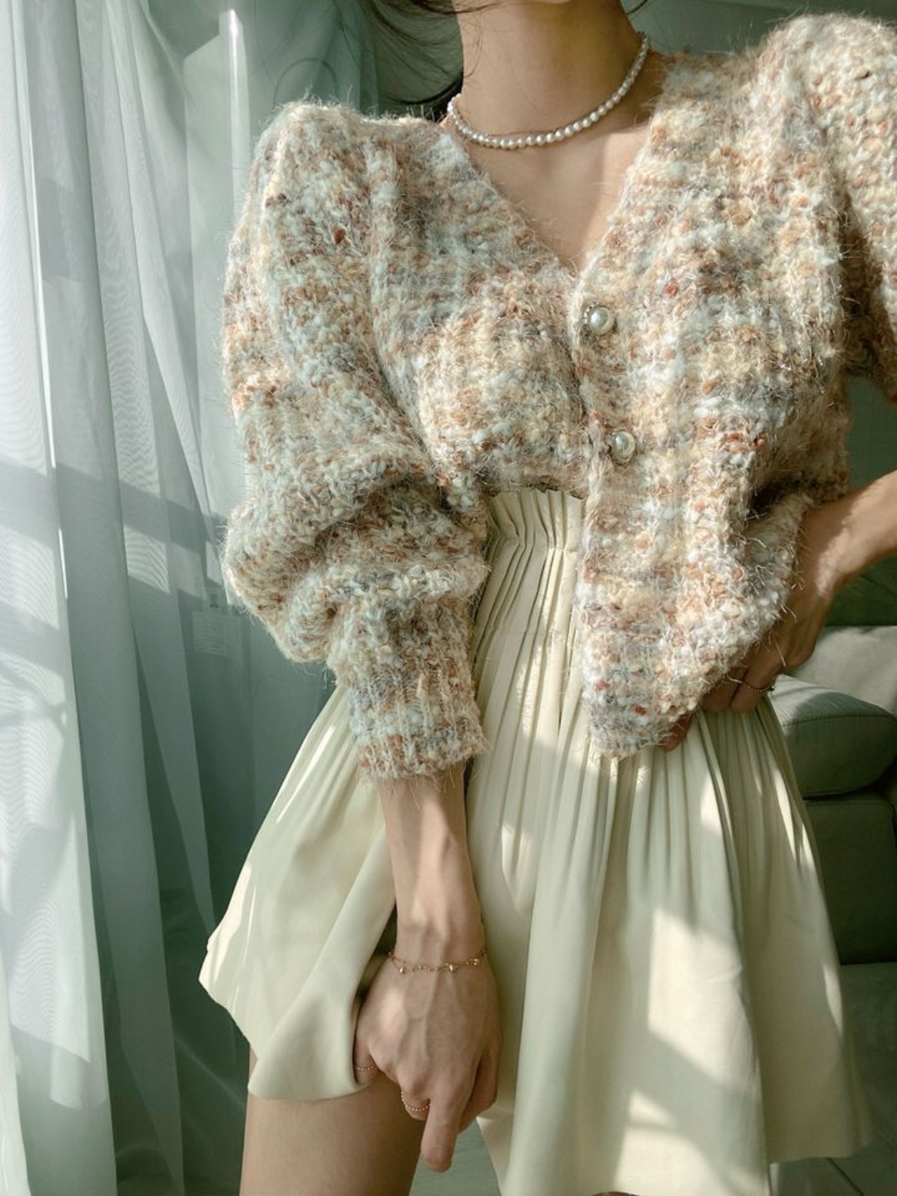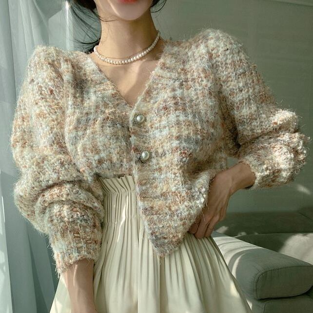 トップス カーディガン ニット 3色 ツイード風 レディース ゆったり 大きめ 長袖 きれいめ エレガント 上品 清楚 水色 ブルー グリーン 緑 青 ベージュ シンプル カジュアル 体型カバー 細見え 着痩せ 秋 冬 春 かわいい 大人可愛い ガーリー オシャレ お洒落 ОL 通勤 デート モテ 女子会 ゆる こなれ感 防寒 あったか 暖かい 休日 お出かけ ショッピング 10代 20代 30代 40代 前開き ルーズ ゆる 韓国 トレンド 流行 Vネック 手触り 着心地 春 秋 冬 パール ボタン
