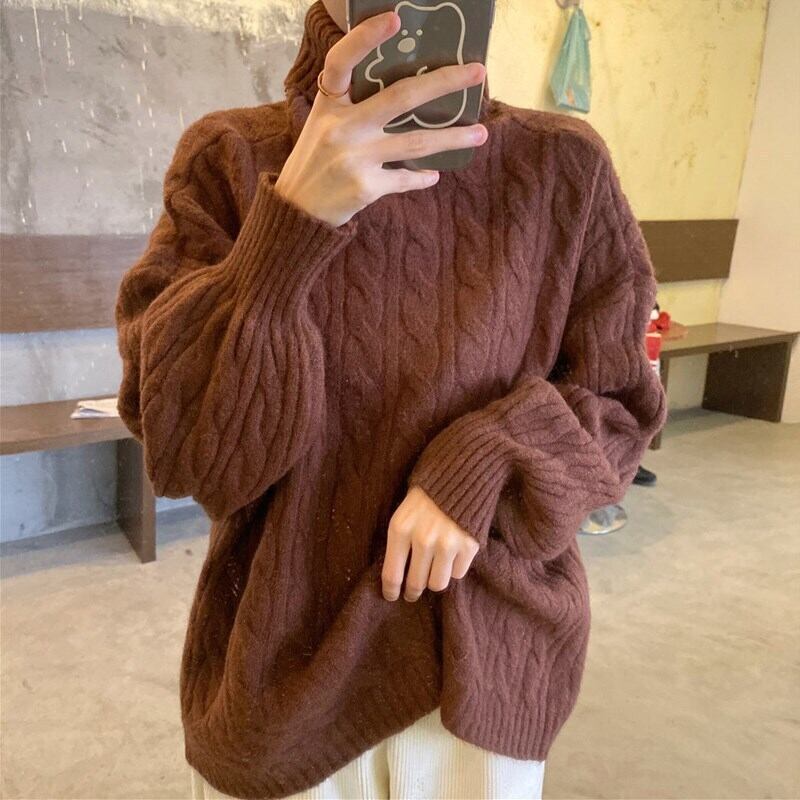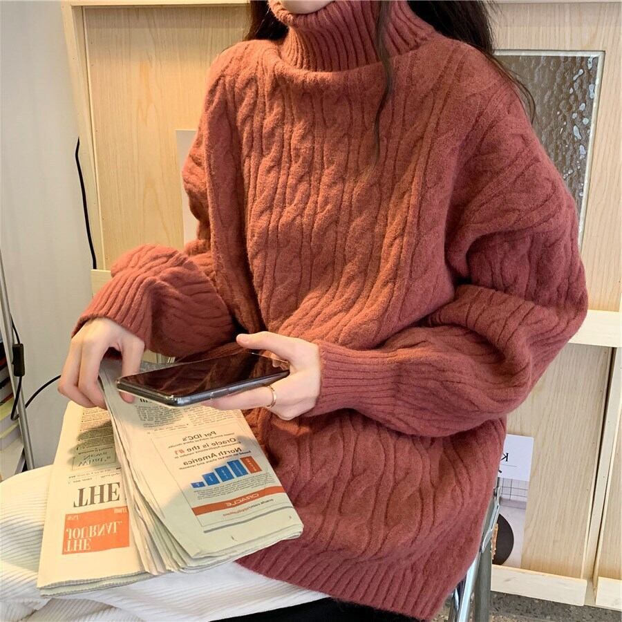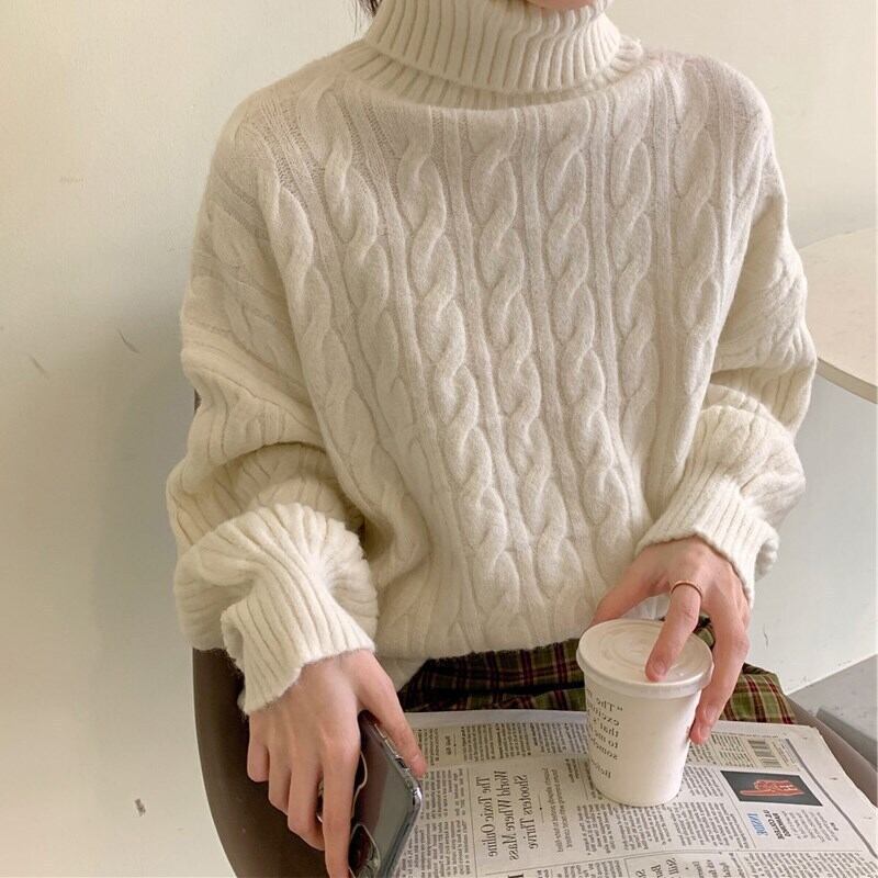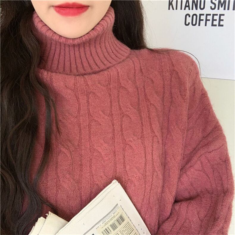 4色カラバリ、タートルネックケーブルニットセーター。