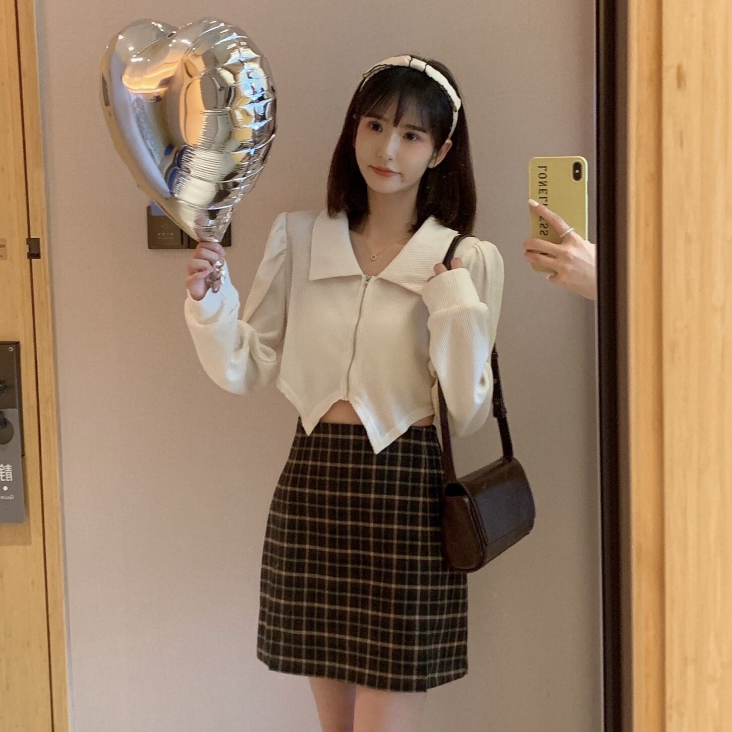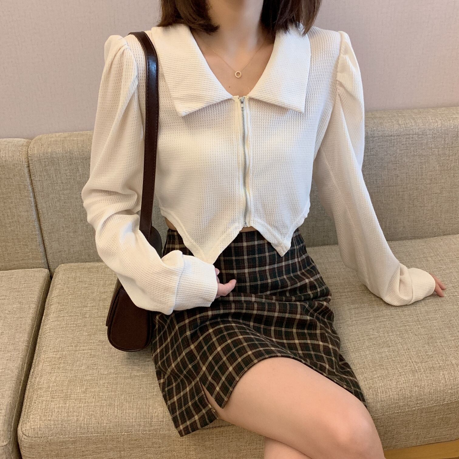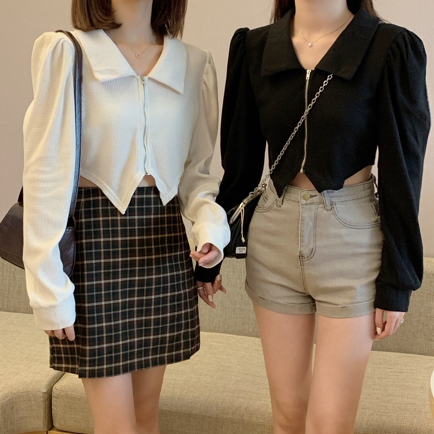 トップス カットソー カーディガン フロントジップ ジップアップ ファスナー 白トップス 前開き 袖あり 長袖 パフスリーブ ショート丈 襟付き リブ ハンカチヘム ヘムカット かわいい きれいめ おしゃれ お洒落 かっこいい こなれ感 キュート 個性的 クール 存在感 抜け感 M L アイボリー ブラック 黒 無地 春 秋 10代 20代 30代 学生 通学 デート お出かけ 女子会 休日 イベント 旅行 普段使い 着回し お揃い 双子 韓国 オルチャン 肌見せ