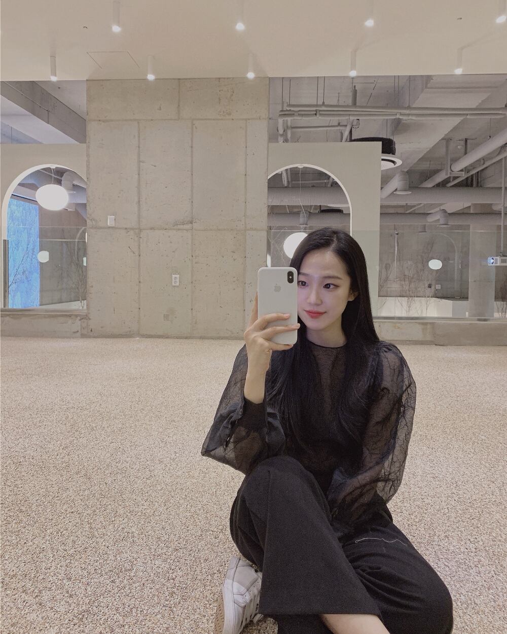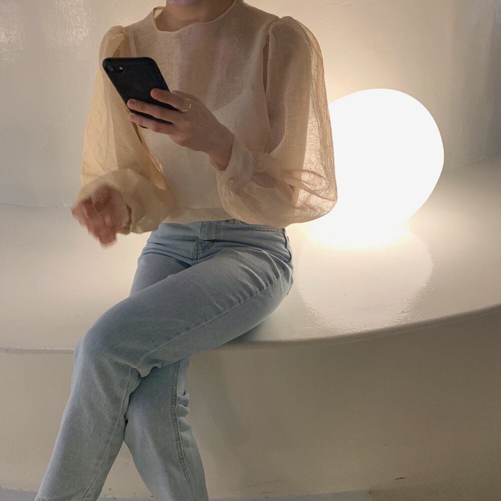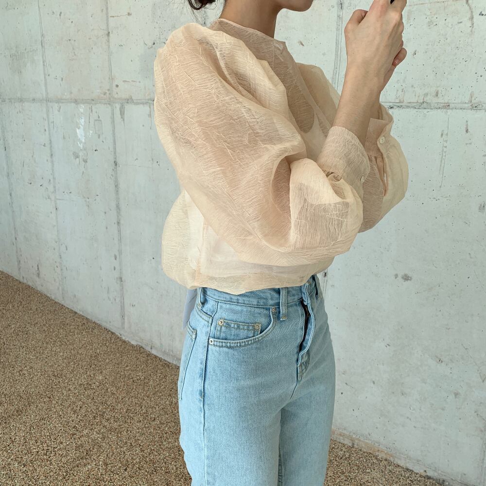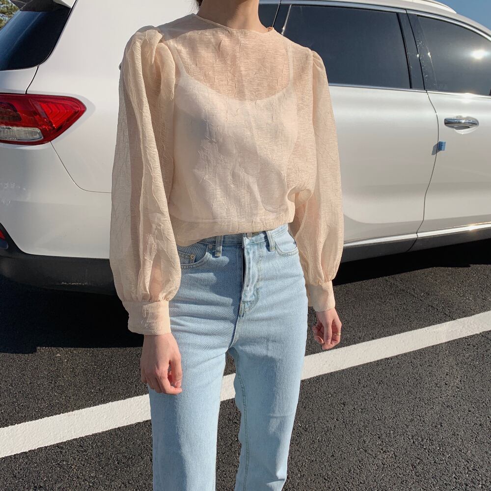 しわ加工が印象的なシースルー長袖ラウンドネックブラウス。