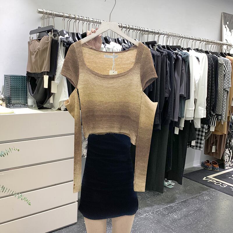トップス ニット アームカバー付き ニットソー 半袖 レディース ショート丈 タイト スリム 細身 セクシー 肌見せ シンプル カジュアル 秋 冬 春 かわいい 大人可愛い オシャレ お洒落 デート モテ 女子会 こなれ感 休日 お出かけ ショッピング 10代 20代 30代 韓国 トレンド 流行 学生 くすみカラー ブラウン 茶色 グレー 灰色 スクエアネック 脚長 美脚 デコルテ 鎖骨 小顔 スタイルアップ くびれ ウエスト 新作 2022 伸縮性 2点セット 韓国 トレンド 流行 今風 薄手