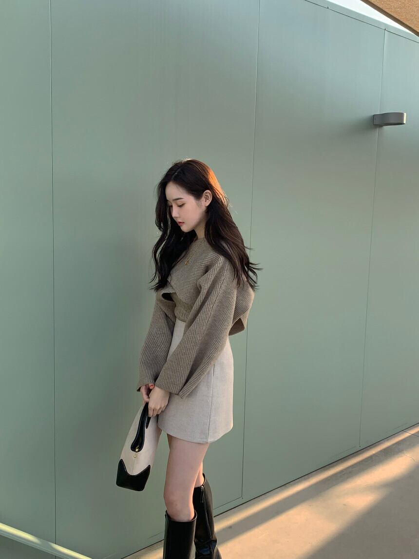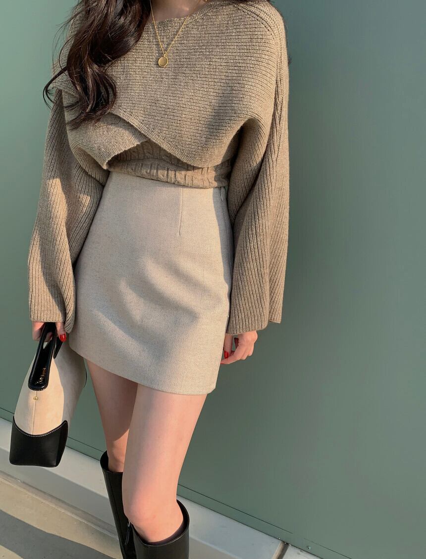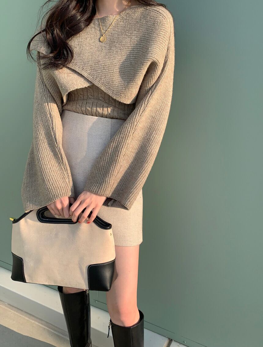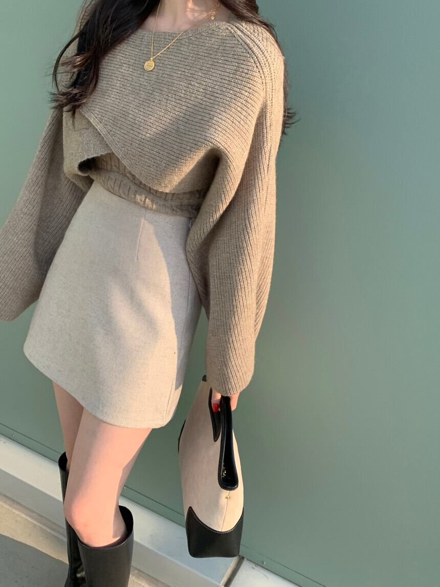 トップス ニット ニットソー 長袖 レディース ショート丈 クロスデザイン ラウンドネック シンプル カジュアル 秋 冬 春 かわいい 大人可愛い オシャレ お洒落 デート モテ 女子会 こなれ感 休日 お出かけ ショッピング 10代 20代 30代 40代 韓国 トレンド 流行 学生 くすみカラー ブラウン 茶色 黒 ブラック 美脚 スタイルアップ 韓国 トレンド 流行 ゆったり 大きめ ワイド レイヤード 新作 2022 アシンメトリー 休日 ショッピング とろみ 抜け感 こなれ感 シック モード