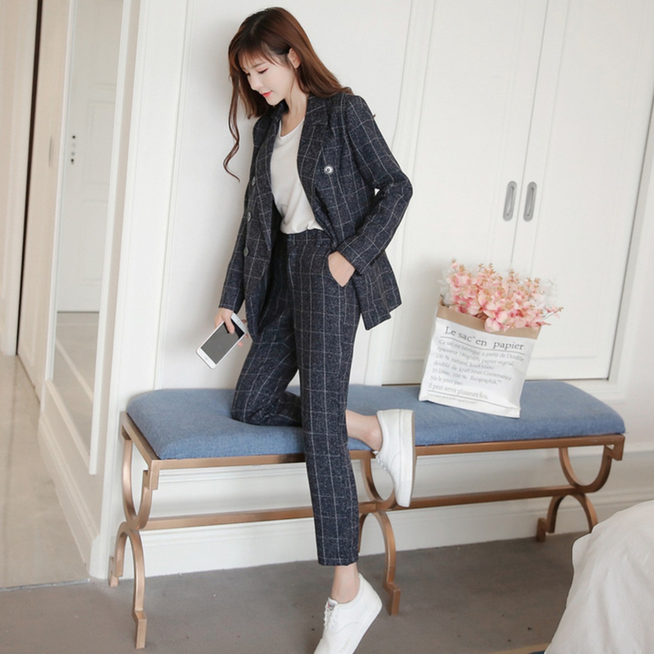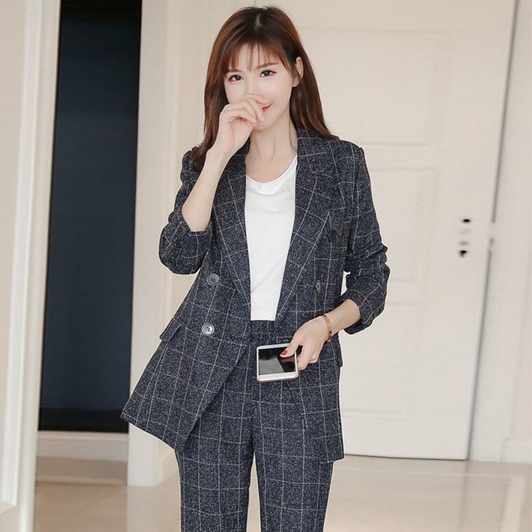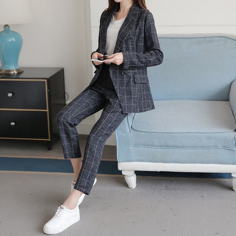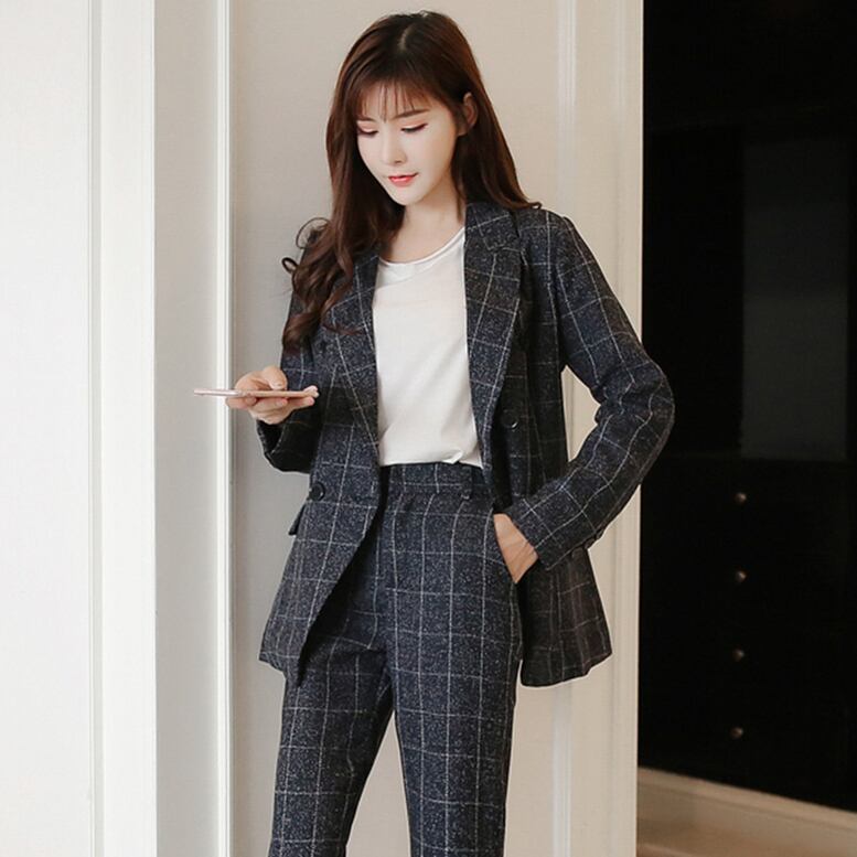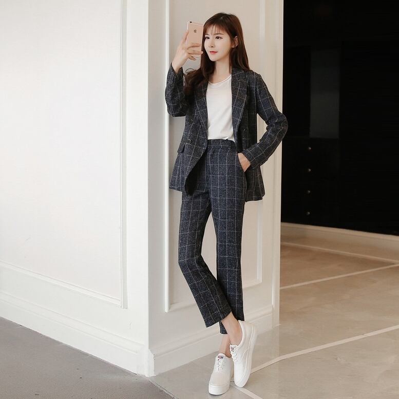 ウィンドウ・ペンのチェック柄がポイントのパンツスーツ