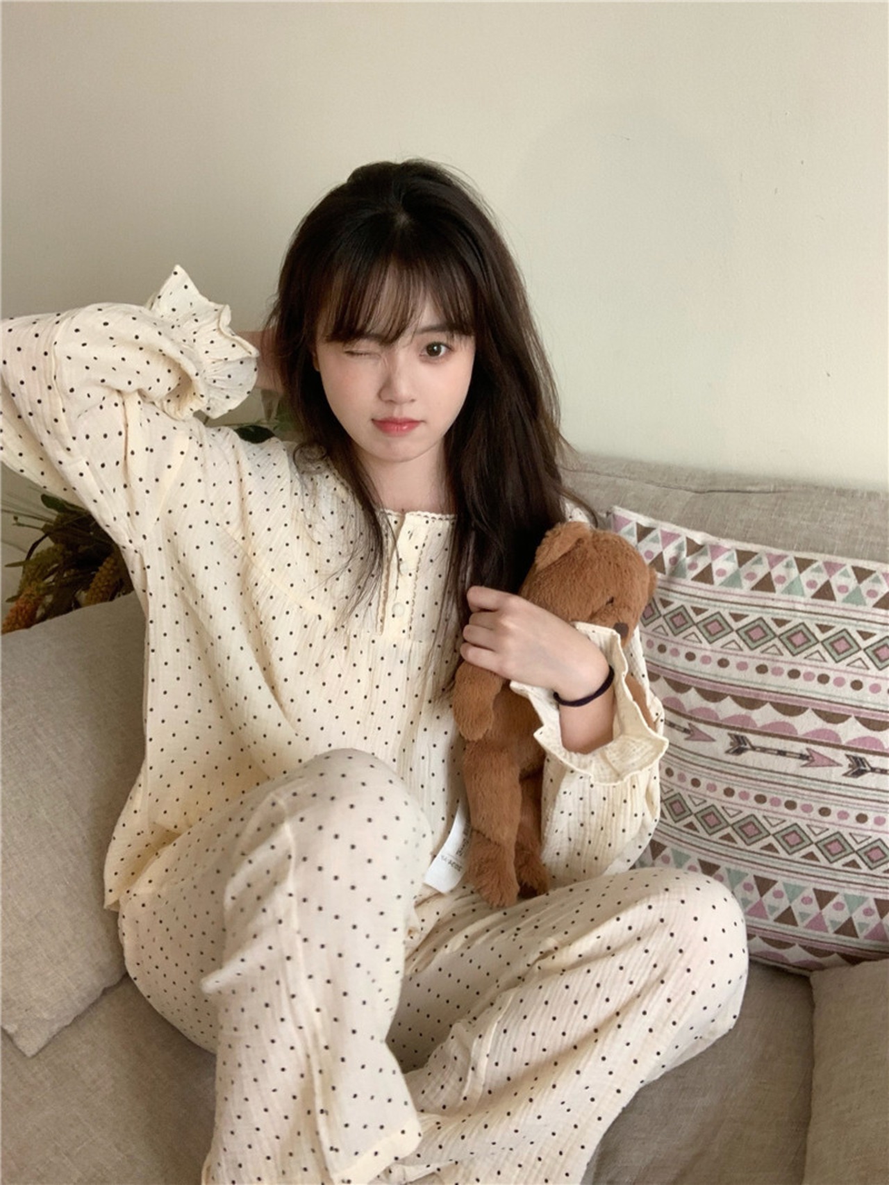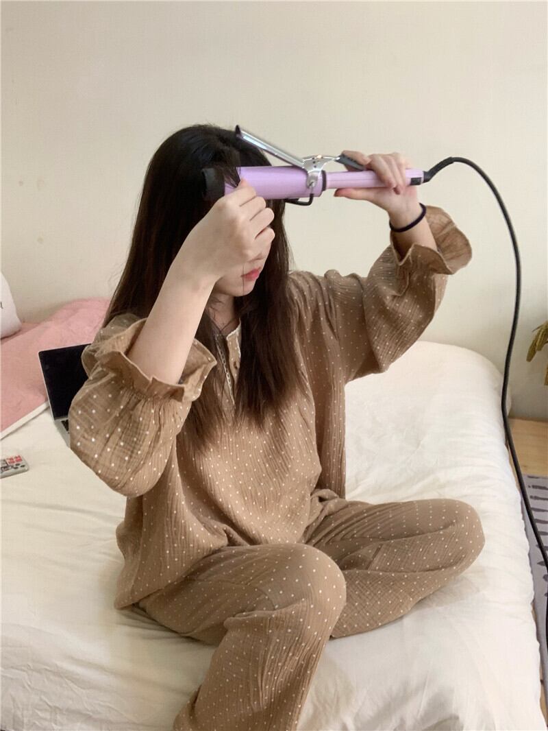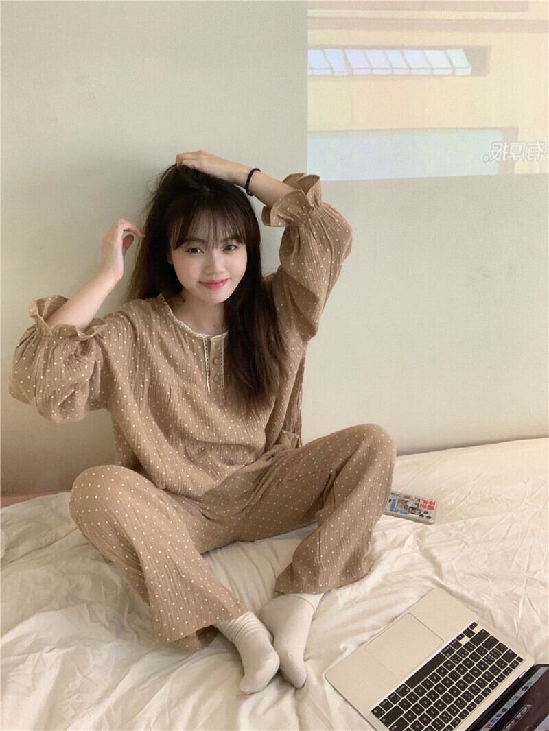パジャマ 上下セット 2色 ドット柄 フリル レディース 長袖 長ズボン ゆったり 2点セット 大きめ ラウンドネック くすみカラー シンプル カジュアル 春 夏 秋 冬 オールシーズン ルームウェア 部屋着 リラックス ベージュ ブラウン 茶色 オシャレ お洒落 かわいい 大人可愛い 10代 20代 30代 40代 お泊り 女子会 旅行 おそろい お揃い 色違い 映え SNS トレンド 韓国 流行 モテ ゆる プレゼント ギフト 薄手 S М L フェミニン フェアリー ウエストゴム 楽ちん 快適