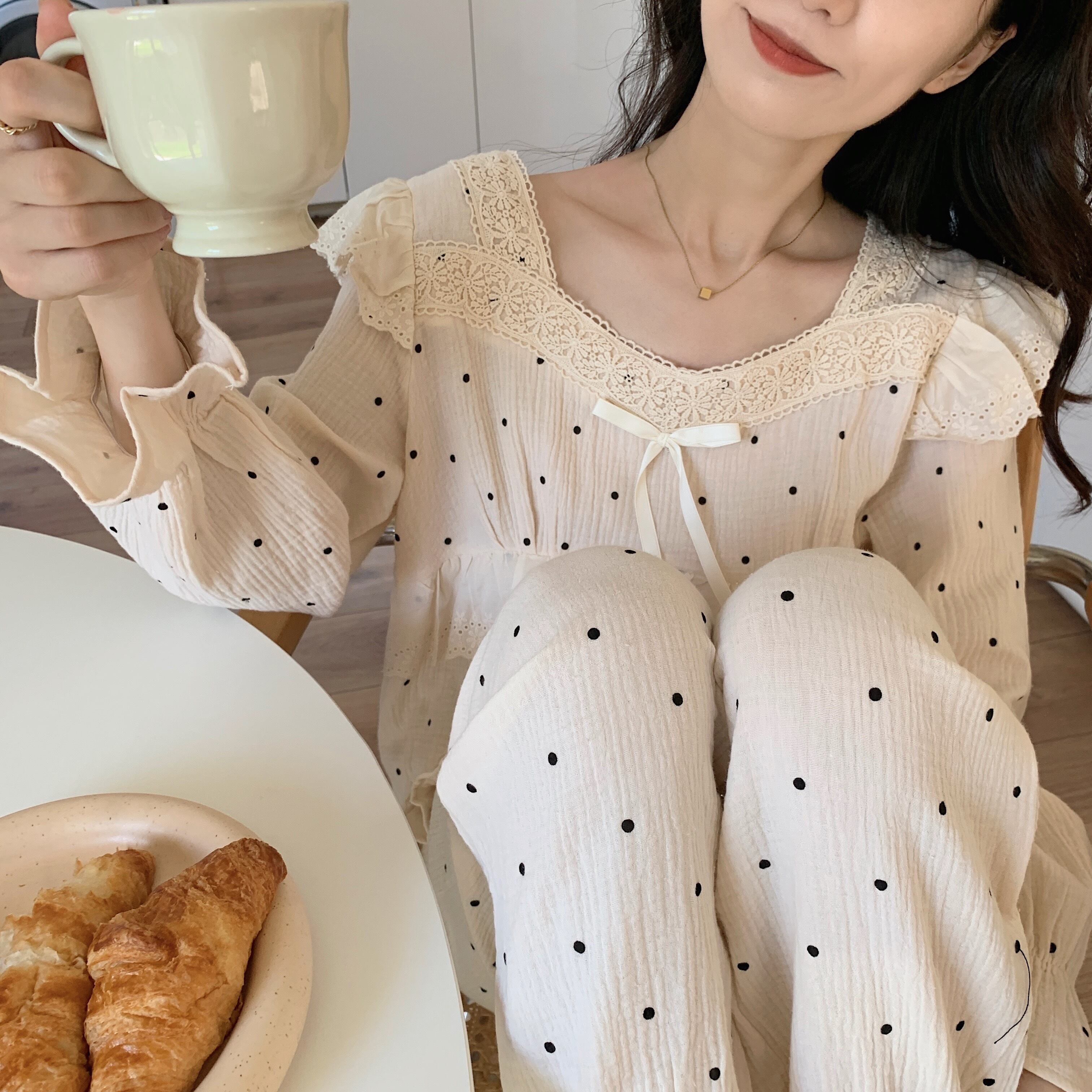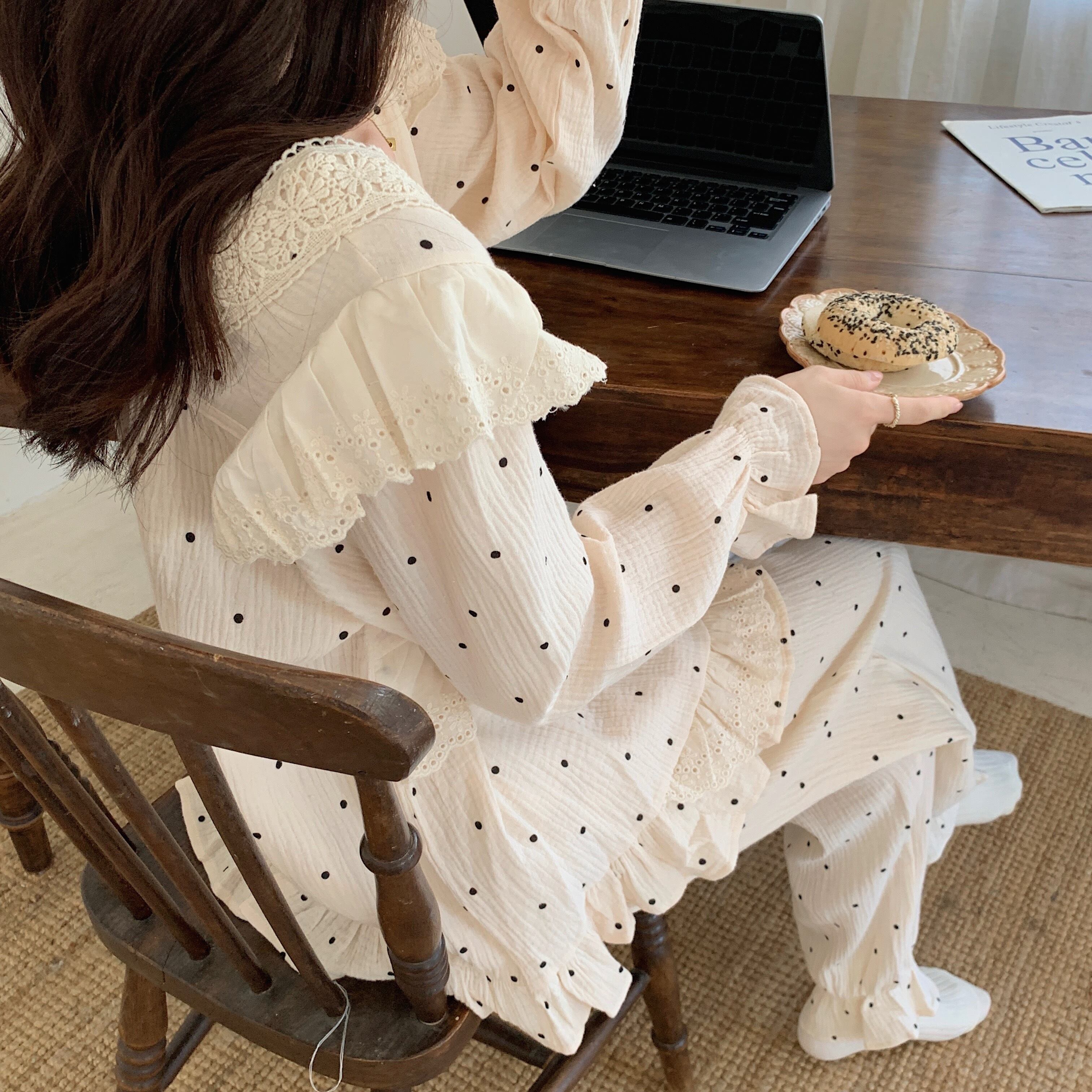 パジャマ 上下セットドット柄 フリル レディース 姫系 量産型 ロリータ 長袖 長ズボン ゆったり 2点セット 大きめ スクエアネック くすみカラー シンプル カジュアル 春 夏 秋 冬 オールシーズン ルームウェア 部屋着 リラックス ベージュ オシャレ お洒落 かわいい 大人可愛い 10代 20代 30代 40代 お泊り 女子会 旅行 おそろい お揃い 色違い 映え SNS トレンド 韓国 流行 モテ ゆる プレゼント ギフト 薄手 М フェミニン フェアリー ガーリー ウエストゴム 楽ちん 快適