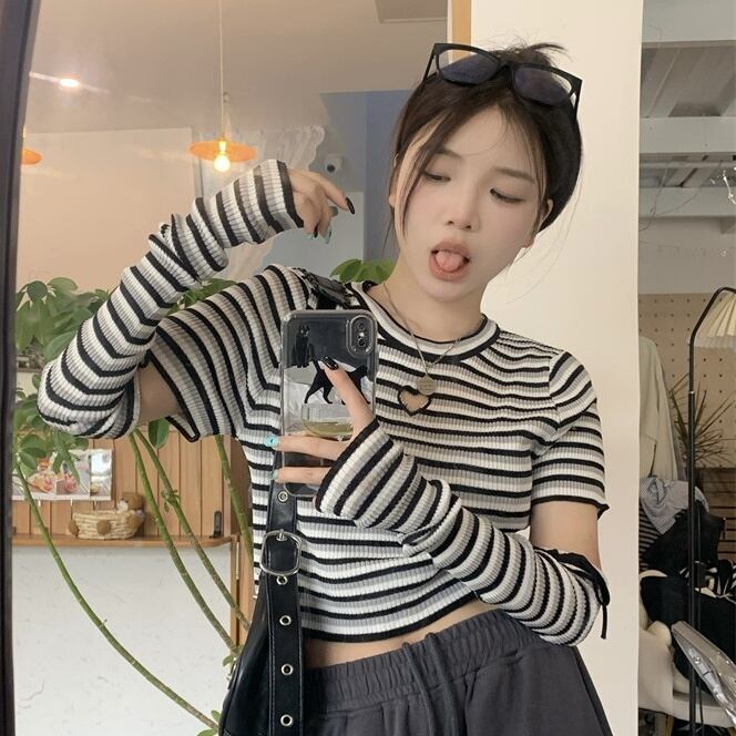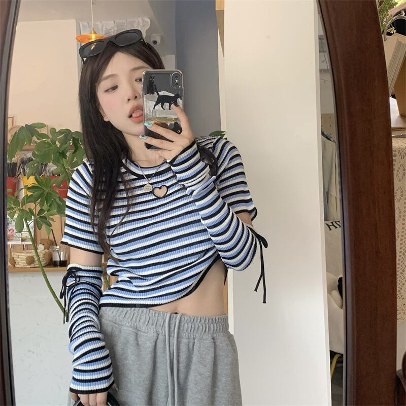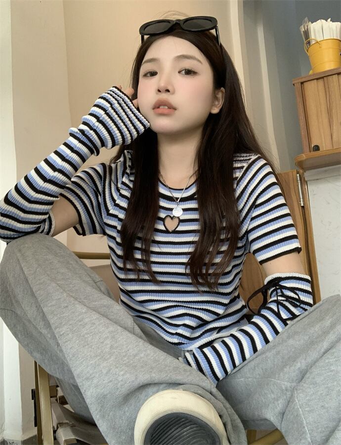 トップス ニット アームカバー付き ニットソー ボーダー 半袖 レディース 穴あき ハート ショート丈 タイト スリム 細身 セクシー 肌見せ シンプル カジュアル 秋 冬 春 かわいい 大人可愛い オシャレ お洒落 デート モテ 女子会 こなれ感 休日 お出かけ ショッピング 10代 20代 30代 韓国 トレンド 流行 学生 ブルー 青 黒 ブラック ラウンドネック 脚長 美脚 セクシー スタイルアップ 新作 2022 伸縮性 2点セット 今風 薄手 アームウォーマー リボン 量産型 地雷系