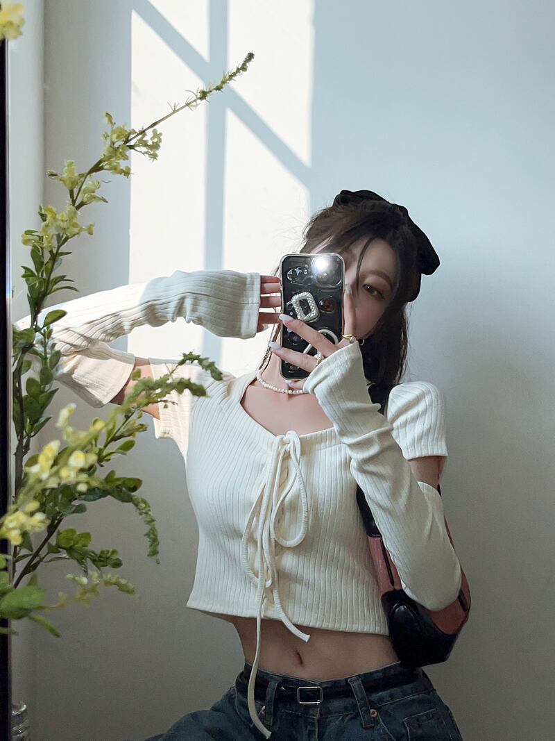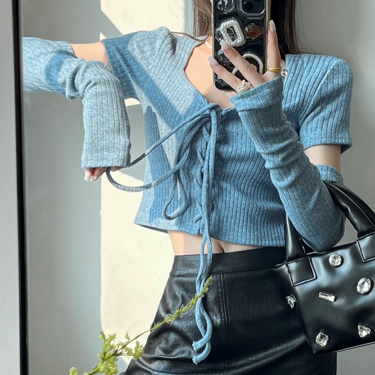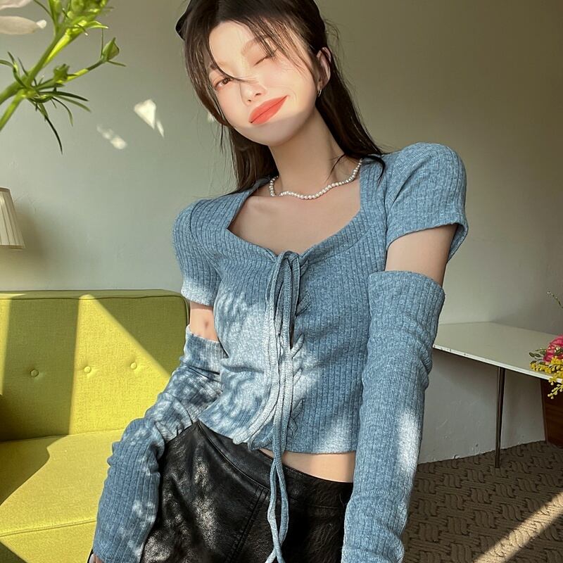 トップス ニット アームカバー付き ニットソー 編み上げ リボン 半袖 レディース スクエアネック ショート丈 タイト スリム 細身 セクシー 肌見せ シンプル カジュアル 秋 冬 春 かわいい 大人可愛い オシャレ お洒落 デート モテ 女子会 こなれ感 休日 お出かけ ショッピング 10代 20代 30代 韓国 トレンド 流行 学生 ブルー 青 ホワイト 白 ベージュ 脚長 美脚 セクシー スタイルアップ 新作 2022 伸縮性 2点セット 今風 薄手 アームウォーマー 無地 デコルテ S М L