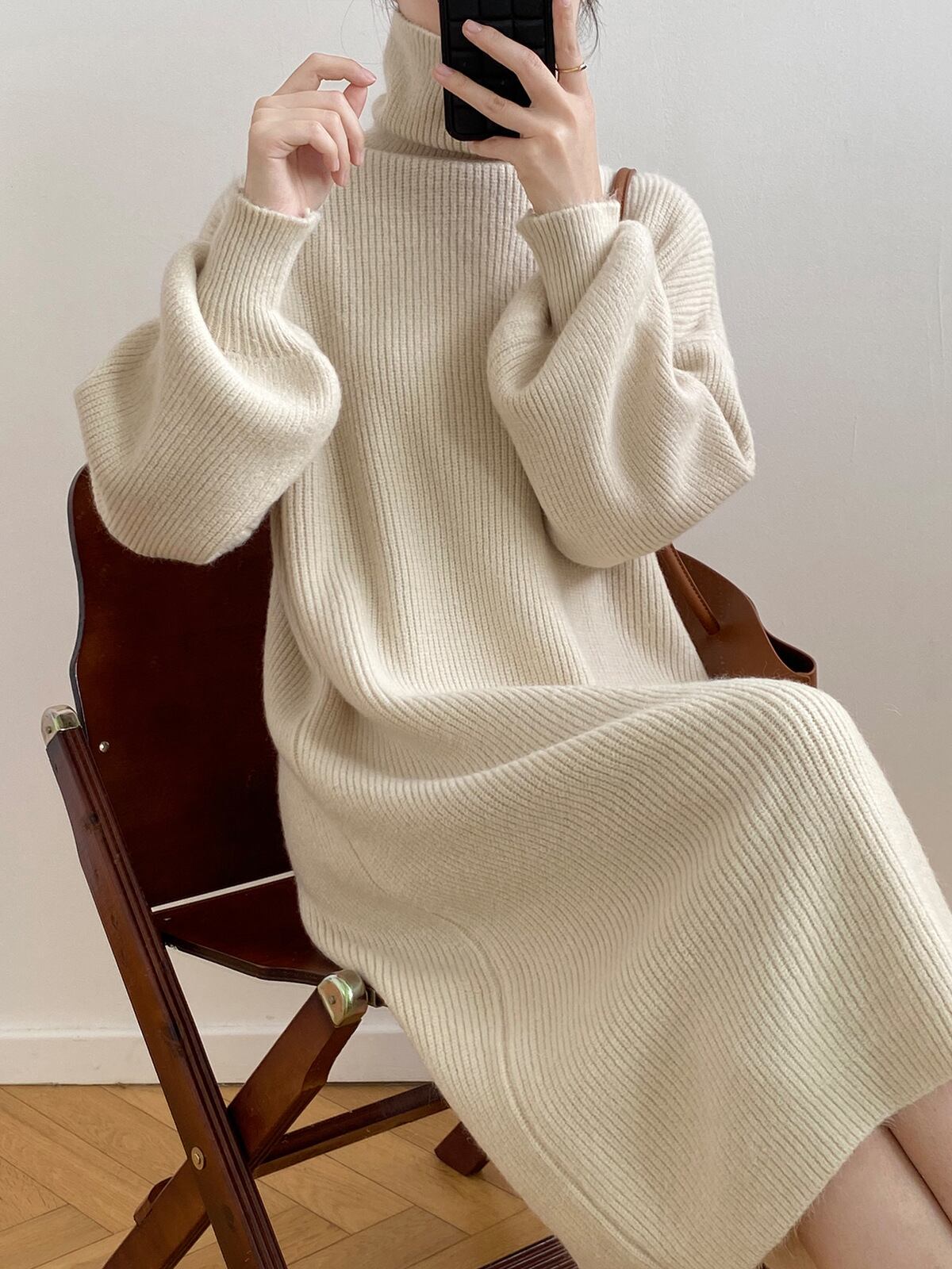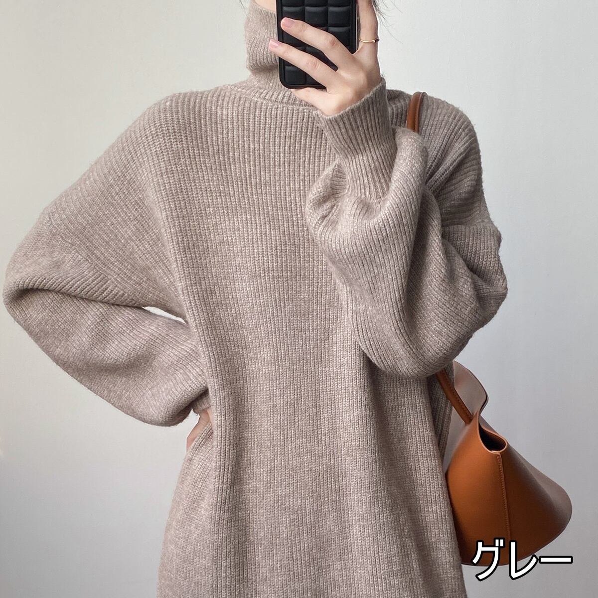 ワンピース ニット ロング丈 5色 タートルネック 長袖 レディース シンプル カジュアル ラフ ルーズ ゆる お洒落 オシャレ かわいい 大人可愛い こなれ感 無地 ベージュ パープル 紫 黄色 イエロー グレー 灰色 ブラウン 茶色 あったか 暖かい Iライン ストレート 体型カバー 着痩せ 細見え ハイネック 小顔 華奢 萌え袖 映え SNS 女子会 デート モテ 韓国 トレンド 20代 30代 40代 50代 ゆったり 大きめ カラバリ 部屋着 ルームウェア リラックス ランタンスリーブ