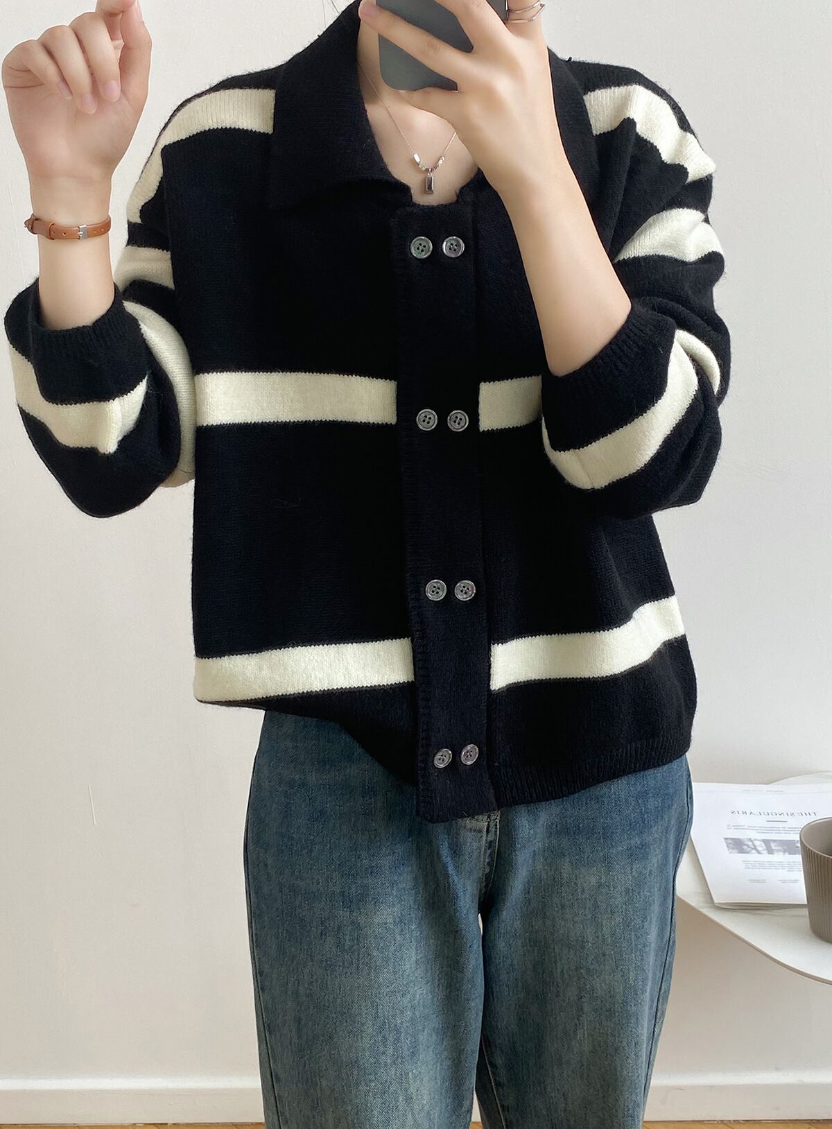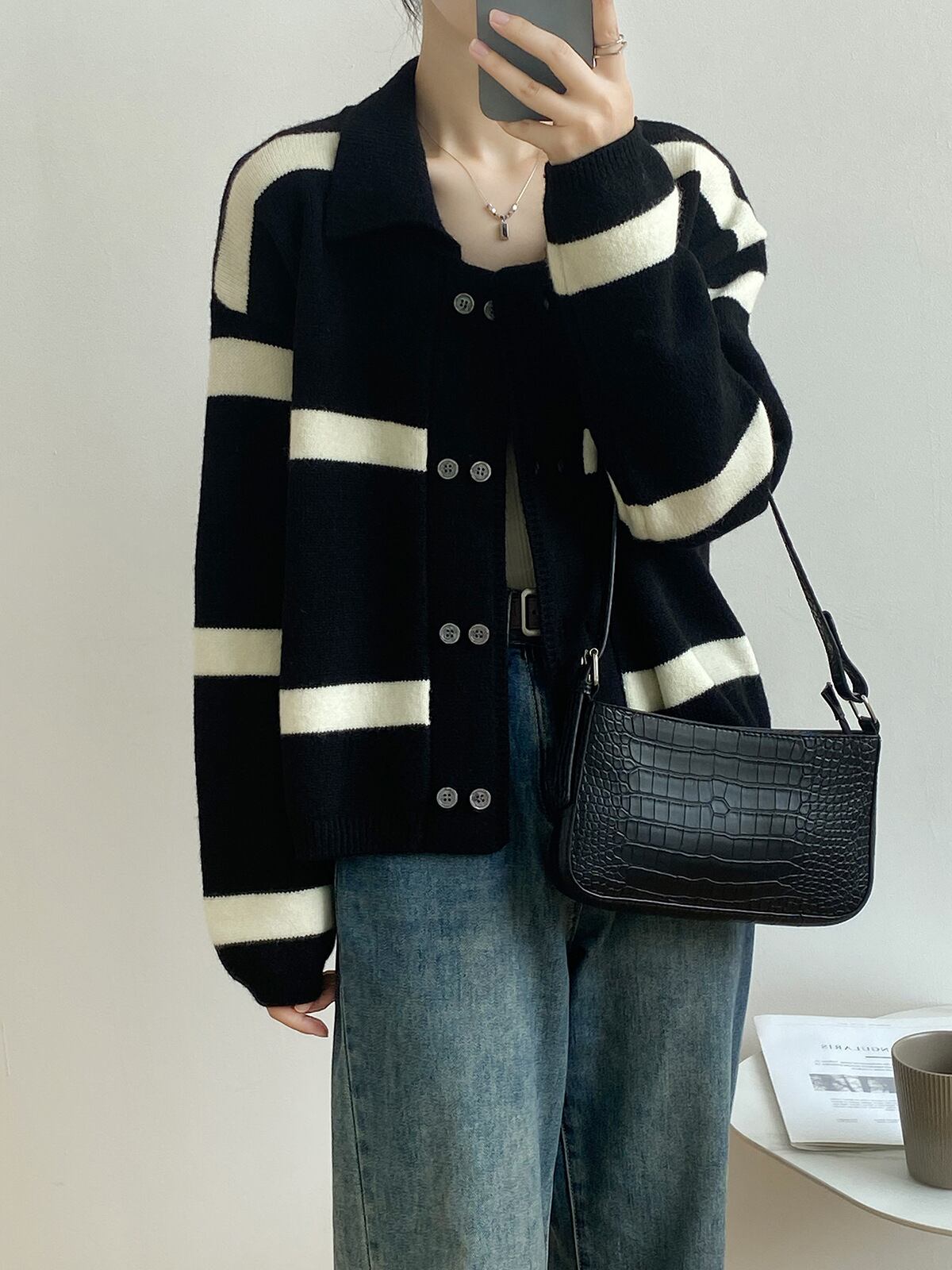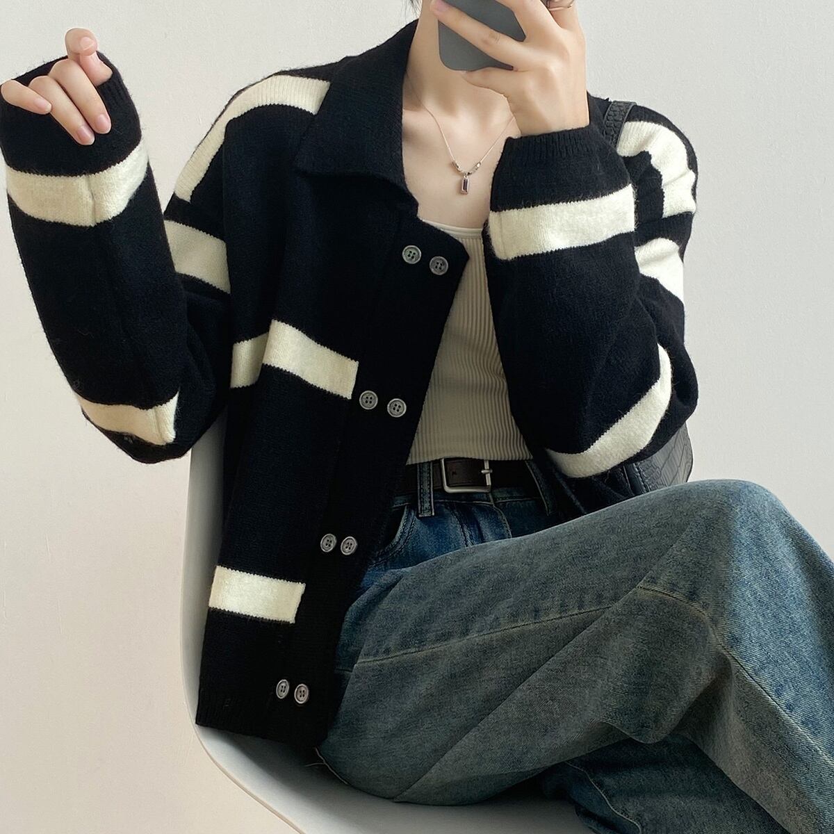 トップス ニット カーディガン レトロ ボーダー ストライプ レディース オシャレ お洒落 かわいい 大人可愛い 20代 30代 40代 50代 60代 着回し 重ね着 シンプル カジュアル ラフ ベージュ ブラック 黒 モノクロ バイカラー ゆったり 大きめ 春 秋 冬 抜け感 こなれ感 ショッピング レトロ アンティーク ヴィンテージ 柔らか 着心地 あったか 暖かい ゆる ルーズ リラックス ルームウェア 体型カバー 新作 2022 個性的 個性派 ドロップショルダー 襟付き