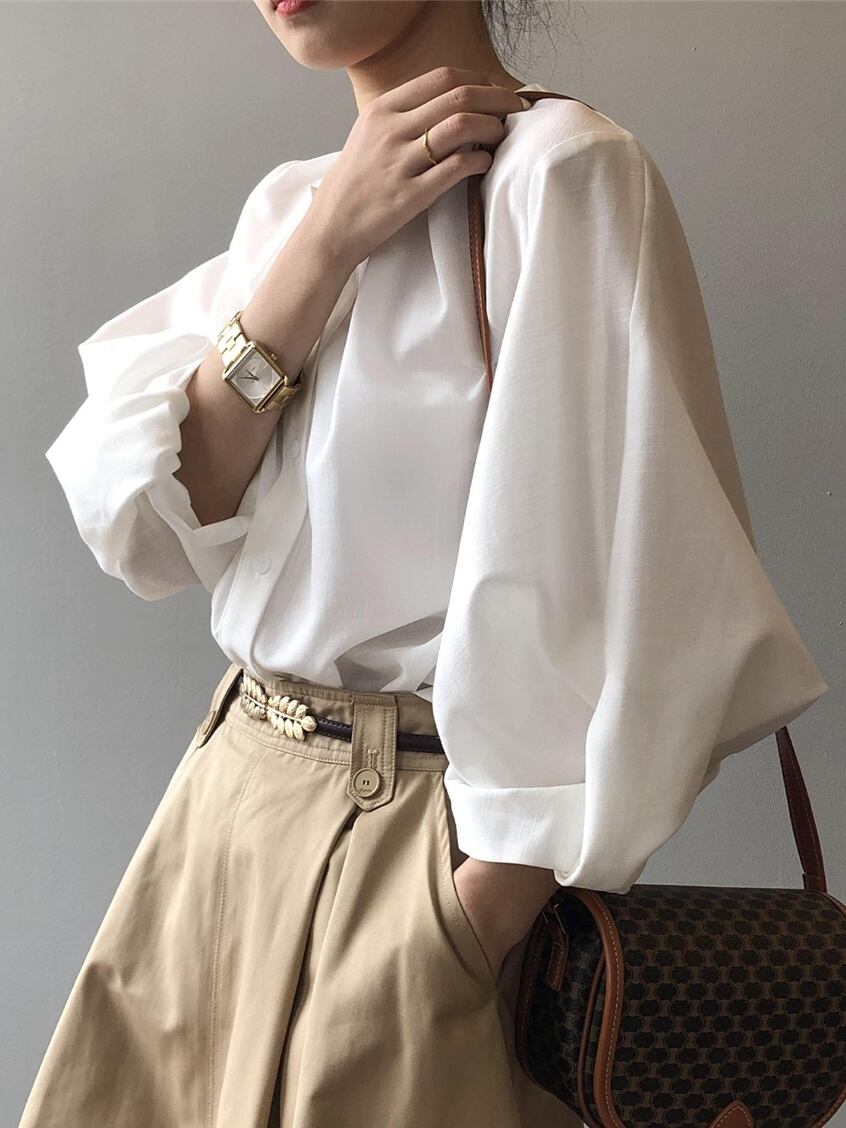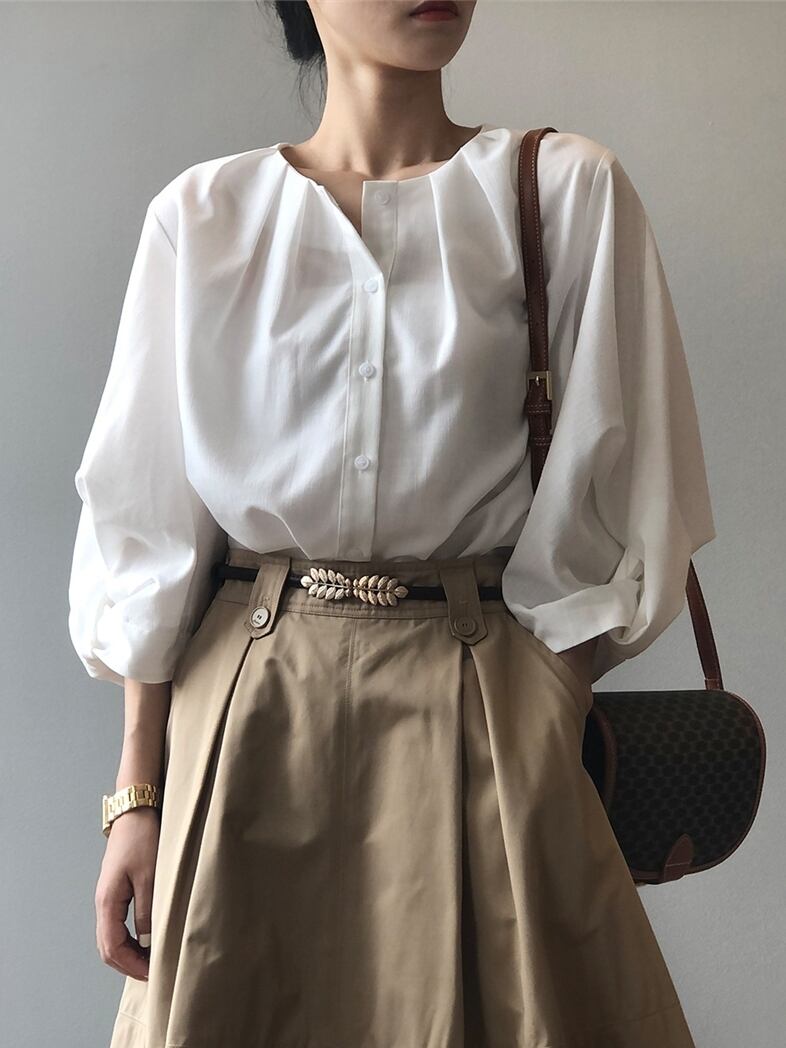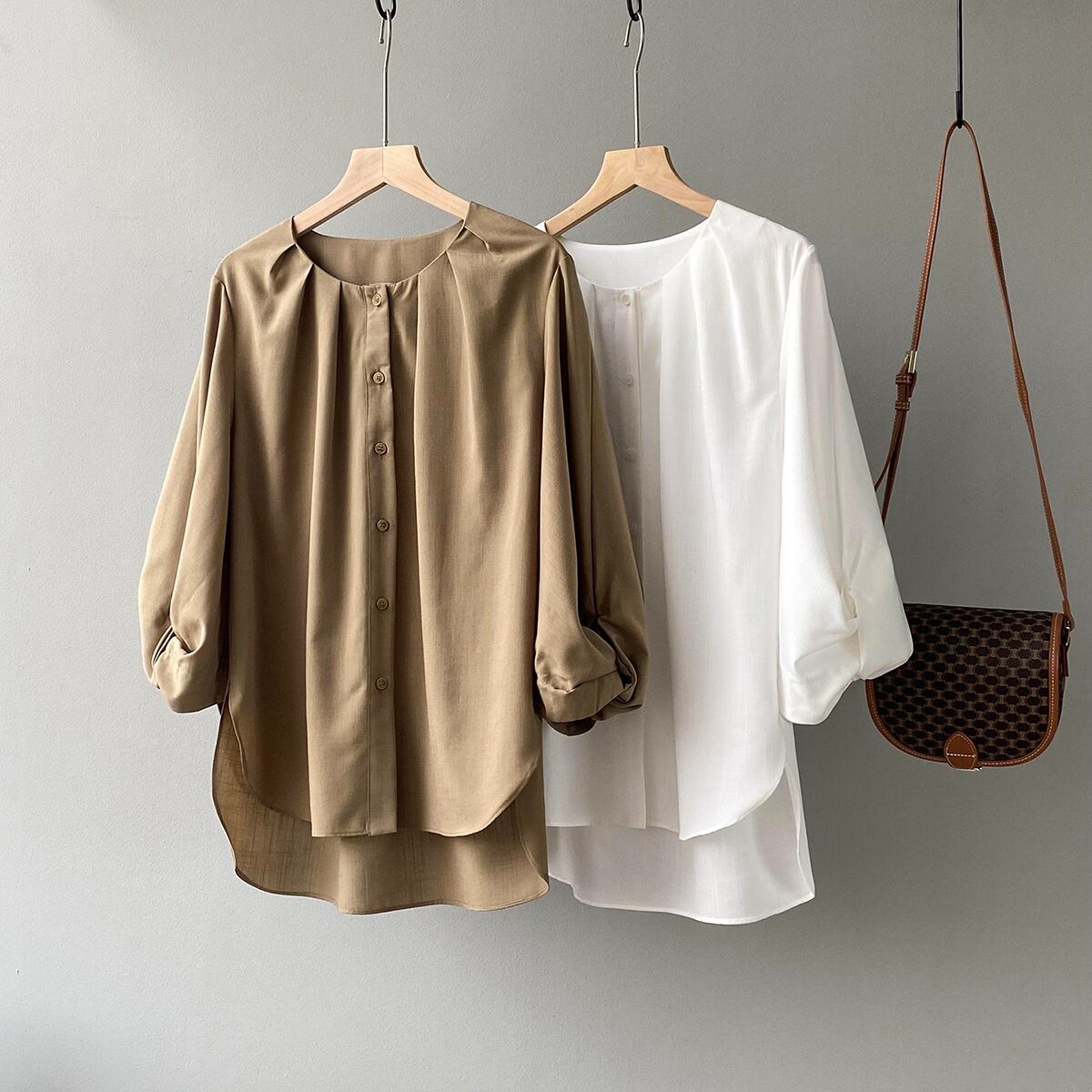 トップス シャツ 白シャツ 白トップス ブラウス 袖あり 7分袖 七分袖 ラウンドネック 襟なし 前開き ボタン ボリューム袖 パフスリーブ 大人可愛い きれいめ シンプル 大人 上品 おしゃれ お洒落 かっこいい 大人女子 こなれ感 エレガント 存在感 抜け感 M L 白 ホワイト ベージュ 無地 春 秋 10代 20代 30代 40代 50代 60代 ママ オフィス ビジネス OL 通勤 学生 通学 デート お出かけ 女子会 休日 旅行 定番 モテ 着回し 普段使い 重ね着 楽ちん 体型カバー