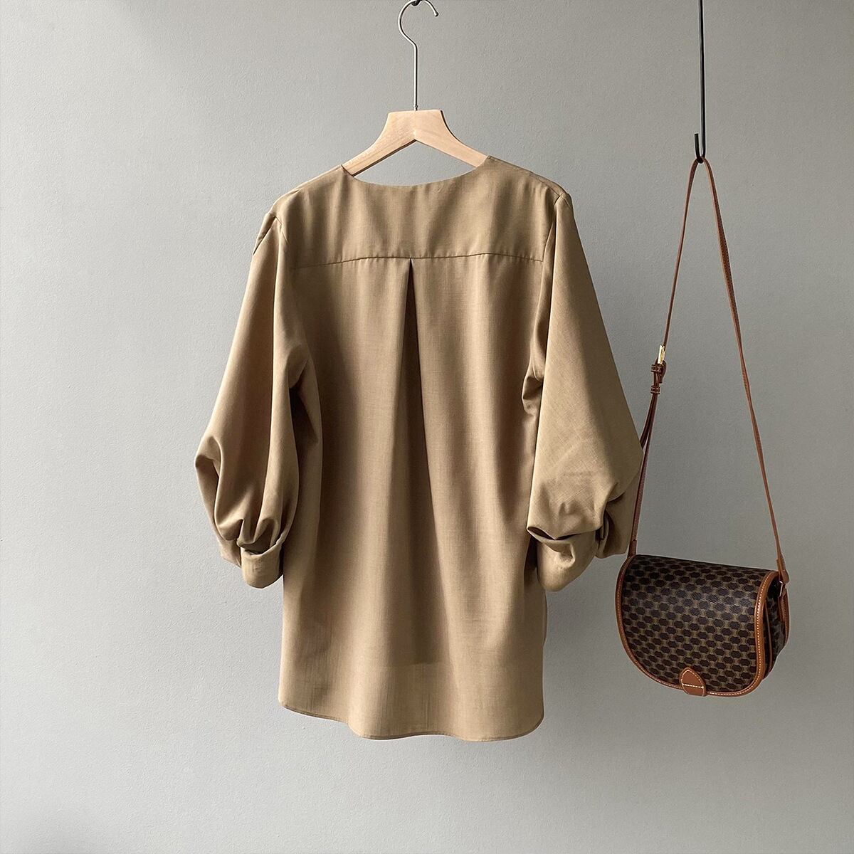 2色カラバリ、七分袖ボリューム袖襟なしシャツブラウス。
