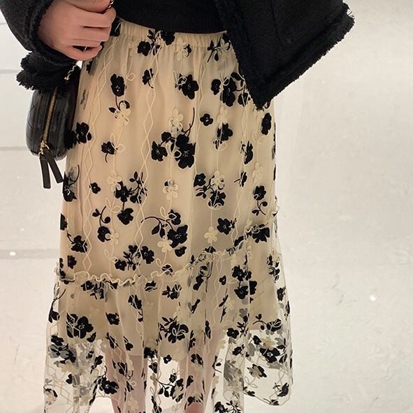 スカート シフォン チュール フラワー 刺繍 レディース ロング丈 ミモレ丈 ガーリー キュート 裏地 Aライン ふんわり フェアリー かわいい 大人可愛い 大人女子 透け感 抜け感 お洒落 オシャレ 上品 きれいめ エレガント 清楚 清潔感 高級感 春 秋 夏 ウエストゴム 20代 30代 40代 50代 人気 トレンド 韓国 流行 膝下 デート モテ 女子会 揺れる 黒 ブラック 白 ホワイト モノクロ シンプル 着回し シースルー とろみ 花 レトロ アンティーク ヴィンテージ 新作 2022