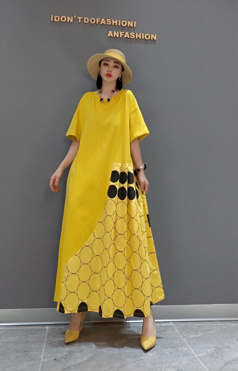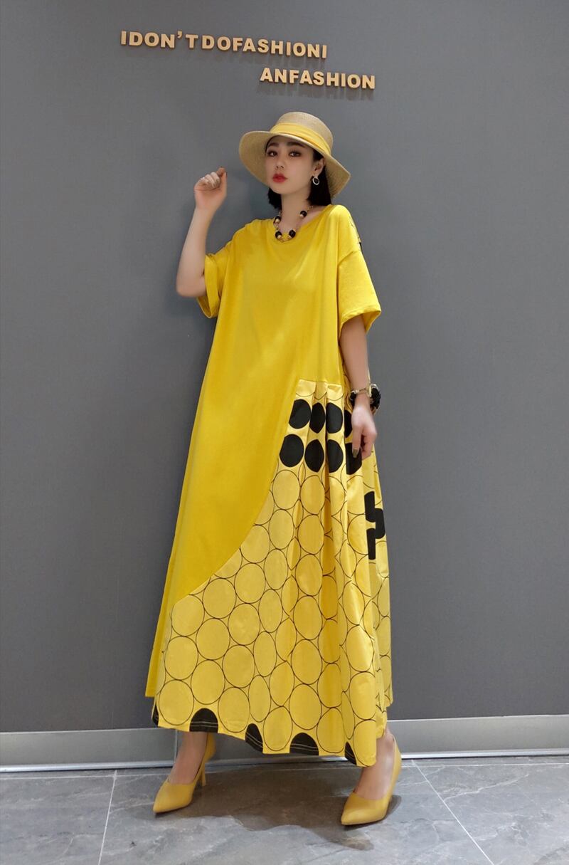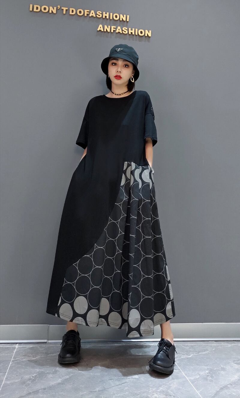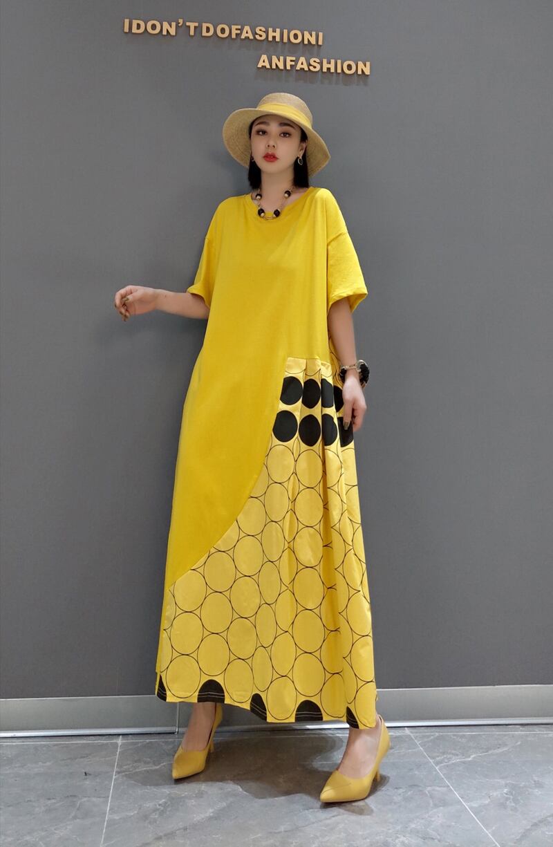 ワンピース 切り替え 2色 ドット柄 ロング丈 レディース ロングワンピ マキシ丈 きれいめ 上品 エレガント 高級感 個性的 個性派 体型カバー 細見え 着痩せ オシャレ お洒落 かわいい 大人可愛い 20代 30代 40代 Aライン ラウンドネック 半袖 スタイルアップ デザイン 新作 2022 春 夏 華奢 アシンメトリー シック モード とろみ ブラック 黒 モノクロ イエロー 黄色 普段使い 映え SNS 女子会 ゆったり 大きめ 大きいサイズ オーバーサイズ ルーズ ドロップショルダー