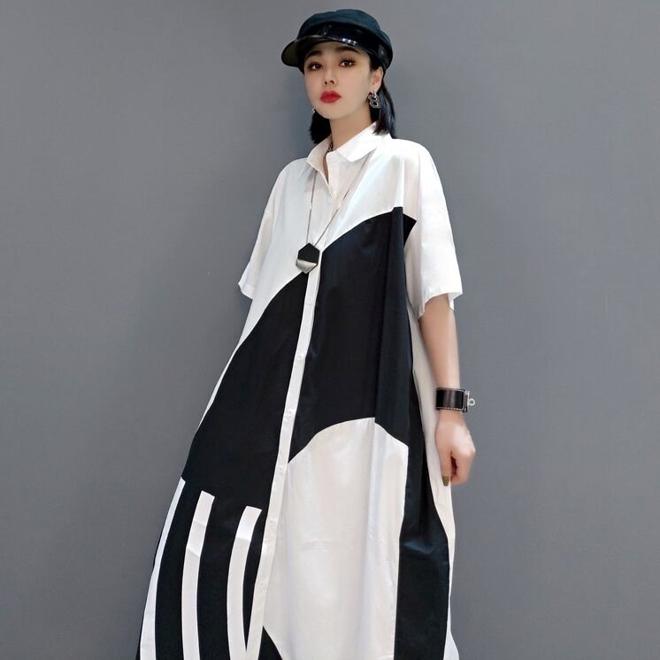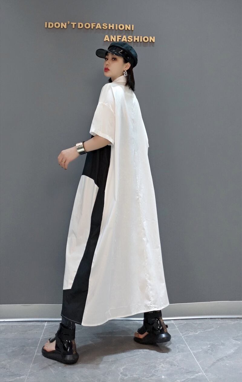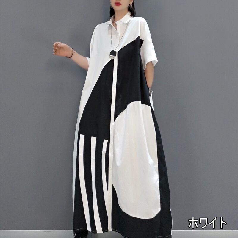 ワンピース バイカラー 2色 ロング丈 レディース シック モード ロングワンピ マキシ丈 きれいめ 上品 エレガント 高級感 個性的 個性派 体型カバー 細見え 着痩せ オシャレ お洒落 かわいい 大人可愛い 20代 30代 40代 Aライン 襟付き 半袖 スタイルアップ デザイン 新作 2022 春 夏 華奢 アシンメトリー とろみ ブラック 黒 モノクロ 普段使い 映え SNS 女子会 ゆったり 大きめ 大きいサイズ オーバーサイズ ルーズ ドロップショルダー アート アーティスティック