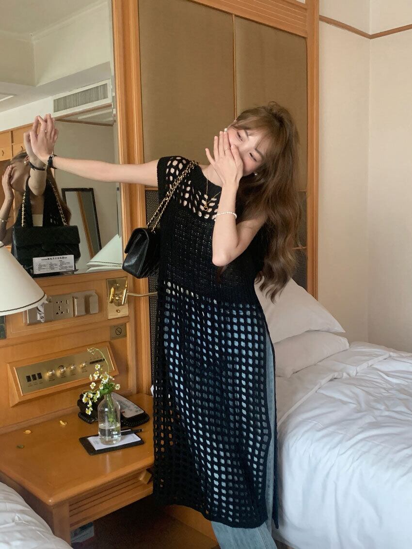 トップス ベスト ニットメッシュ ロング丈 レディース スリット ノースリーブ 春 夏 秋 Iライン ストレート 膝上 体型カバー 着痩せ 細見え 韓国 トレンド 流行 かわいい 大人可愛い お洒落 オシャレ シンプル カジュアル ラフ こなれ感 ゆる 無地 ざっくり ベージュ ホワイト 白 黒 ブラック 映え SNS 女子会 デート ルーズ 休日 お出かけ 買い物 ざっくり 楽ちん モテ コーデ 抜け感 肌見せ 脚長 美脚 体型カバー ラウンドネック シアー 10代 20代 30代 40代 50代