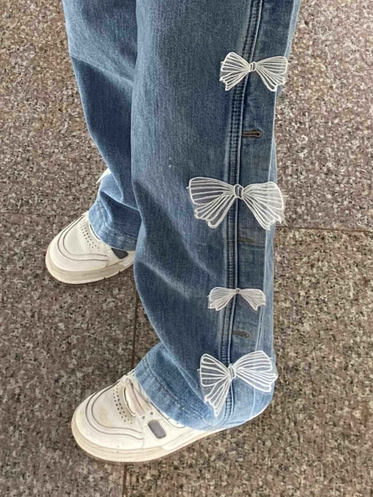ボトムス デニム パンツ サイドリボン プラスサイズ ジーンズ レディース ハイウエスト かわいい 大人可愛い ガーリー フェミニン レース ゆったり シンプル カジュアル ラフ こなれ感 オシャレ お洒落 ストレート 美脚 脚長 着回し ブリーチ 加工 色落ち オールシーズン 春 夏 秋 冬 ブルー タック ショッピング 買い物 女子会 デート モテ ズボン ロング丈 ジーパン 新作 2022 定番 王道 サイズ展開 М L XL 2XL 3XL 4XL 個性的 個性派 映え SNS