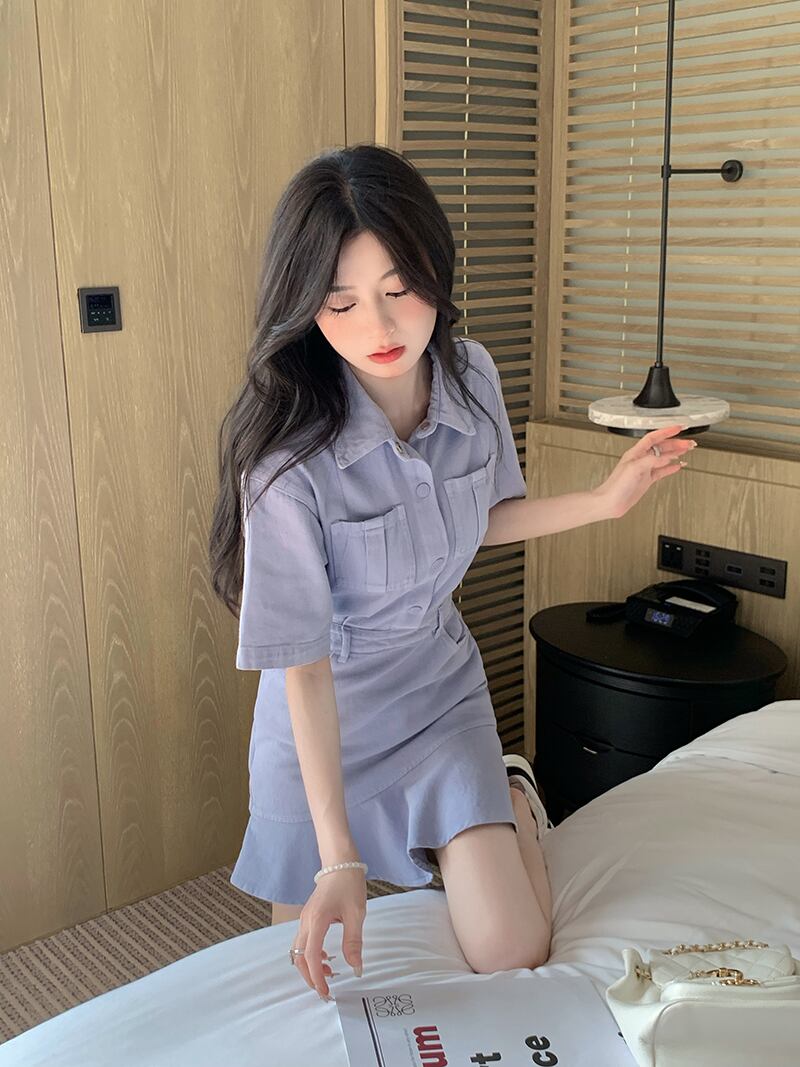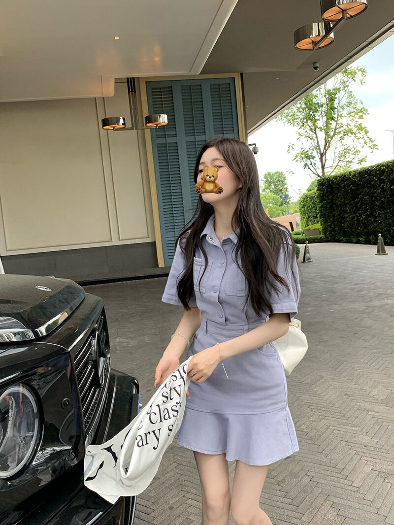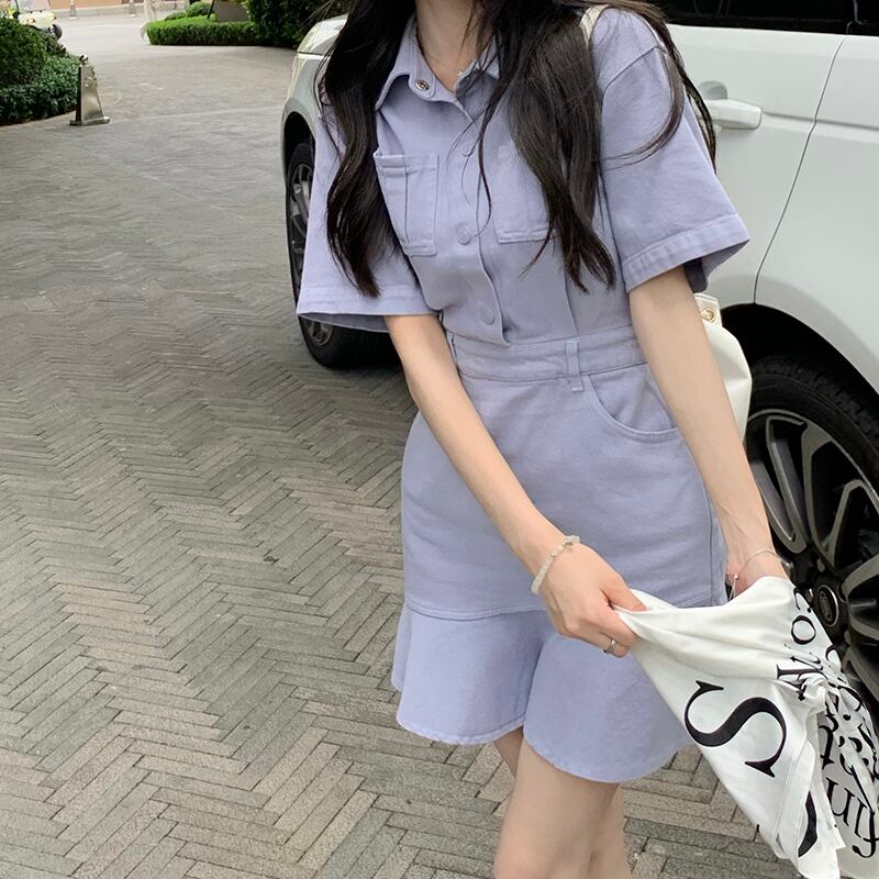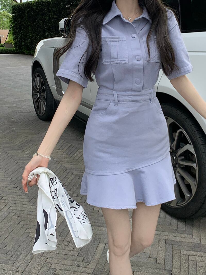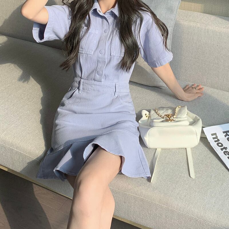 ワンピース デニム マーメイドワンピース レディース 襟付き 半袖 五分袖 ハイウエスト 裾フレア タイト スリム 水色 青 ブルー かわいい 大人可愛い きれいめ ガーリー キュート 春 夏 デート 女子会 モテ 映え SNS 美脚 脚長 スタイルアップ シャツワンピース S М L ショート丈 ミニ丈 膝上 前開き ボタン ポケット 韓国 トレンド 流行 色落ち ブリーチ 加工 カジュアル お洒落 オシャレ こなれ感 10代 20代 30代 新作 2022 休日 お出かけ ショッピング ふんわり