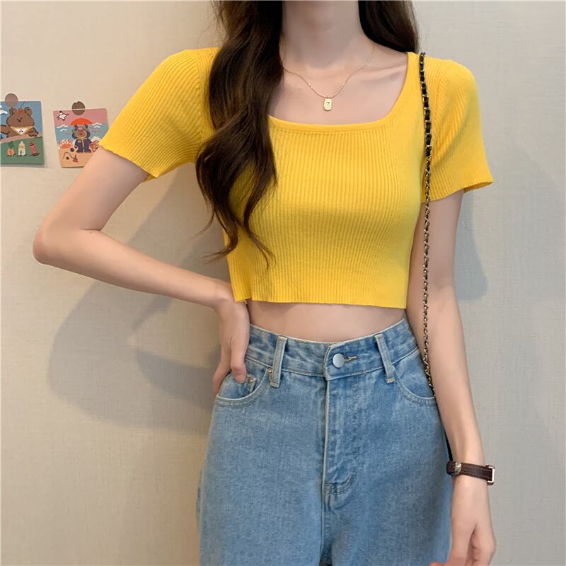 トップス 5色 シャツ カットソー レディース ショート丈 タイト スリム 細身 半袖 きれいめ エレガント 上品 清楚 シンプル カジュアル 春 夏 かわいい 大人可愛い オシャレ お洒落 デート モテ 女子会 こなれ感 休日 お出かけ ショッピング 10代 20代 30代 40代 50代 韓国 トレンド 流行 手触り 着心地 学生 くすみカラー ブラック ホワイト ブルー パープル イエロー スクエアネック 脚長 美脚 デコルテ 鎖骨 小顔 スタイルアップ くびれ ウエスト 新作 伸縮性 薄手