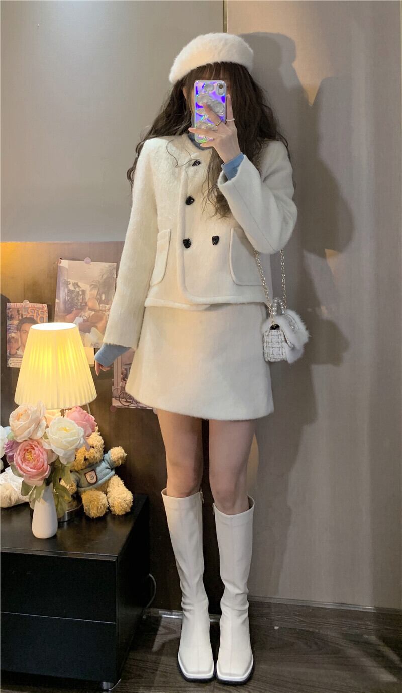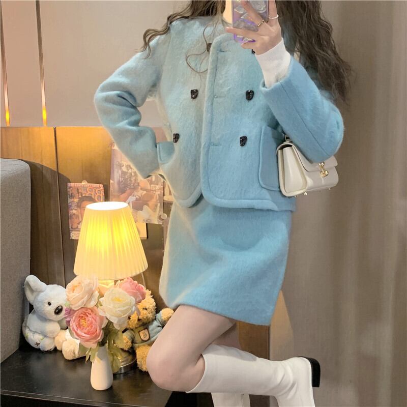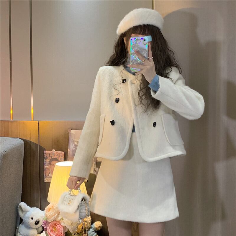 セットアップ スーツ ジャケット ショートコート ミニスカート クロップド丈 長袖 ノーカラー 襟なし 台形スカート ポケット ダブルブレスト ボタン 起毛 ツーピース 上下セット 2点セット かわいい きれいめ 上品 おしゃれ お洒落 こなれ感 キュート ガーリー ラブリー フェミニン 存在感 主役級 S M L アイボリー 白 ホワイト 水色 ブルー 無地 冬 秋 クリスマス バレンタイン 10代 20代 30代 女の子 学生 デート お出かけ 女子会 休日 パーティー イベント モテ 美脚 脚長