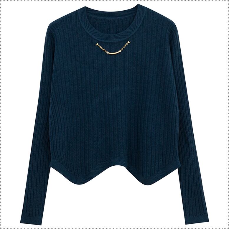 ネックチェーン付きイレヘムリブニット トップス レディース ニット リブニット チェーン ラウンド裾 長袖 クルーネック ラウンドネック リブ セーター プルオーバー 無地 スタイリッシュ 青 ピーコックブルー 大人可愛い きれいめ 上品 エレガント フォーマル ガーリー 春 夏 秋 冬 二次会 オフィス OL 通勤 学生 通学 デート お出かけ パーティー イベント 女子会 休日 体型カバー 普段使い 定番 トレンド ダメージ ゆったり インスタ映え シンプル 大人女子 ニュアンスカラー