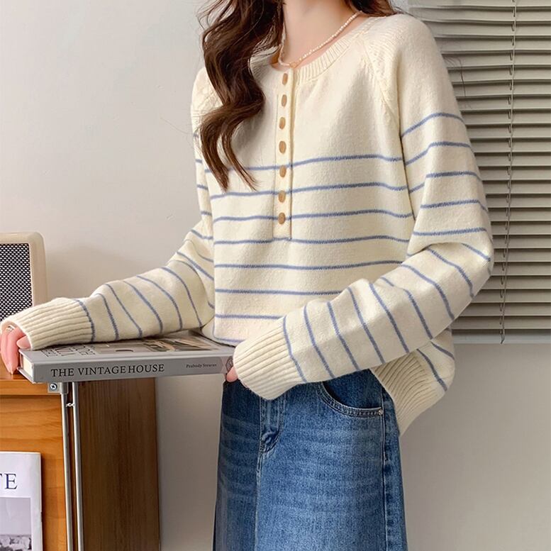 ボーダー柄ニット トップス レディース ニット ボーダー プルオーバー ラウンドネック 長袖 ドロップショルダー フロントボタン セーター プルオーバー 白 オフホワイト アイボリー 大人可愛い きれいめ 上品 エレガント ガーリー マニッシュ ルーズ キュート レトロ 春 夏 秋 冬 二次会 オフィス OL 通勤 学生 通学 デート お出かけ パーティー イベント 女子会 休日 アウトドア 体型カバー モテ 普段使い トレンド 暖かい オーバーサイズ ゆったり インスタ映え くすみカラー アースカラー