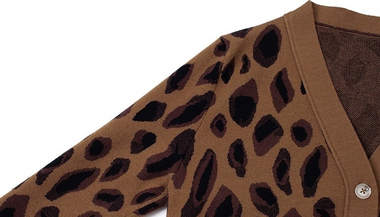 トップス ニット カーディガン ヒョウ柄 長袖 レディース 前開き ボタン ポケット ゆったり タイト スリム シンプル カジュアル ラフ 総柄 ブラウン 茶色 黒 ブラック 豹柄 アニマル くすみカラー ルーズ ゆる 休日 お出かけ ショッピング 女子会 ギャル 体型カバー 着痩せ 細見え 10代 20代 30代 40代 春 秋 冬 お洒落 オシャレ かわいい 大人可愛い 映え SNS あったか 暖かい 抜け感 こなれ感 Vネック デコルテ 華奢 小顔 個性的 個性派 S М ヴィンテージ アンティーク