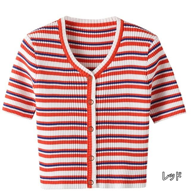 トップス ニット カーディガン バイカラー ボーダー ストライプ レディース ニットソー ショート丈 タイト スリム 半袖 シンプル カジュアル ラフ 着痩せ 春 夏 かわいい 大人可愛い ガーリー フェミニン ポップ お洒落 デート 女子会 こなれ感 休日 お出かけ ショッピング 10代 20代 30代 40代 韓国 流行 着心地 学生 黄色 イエロー 赤 レッド ピンク 重ね着 薄手 伸縮性 着回し サマーニット Vネック 脚長 美脚 スタイルアップ