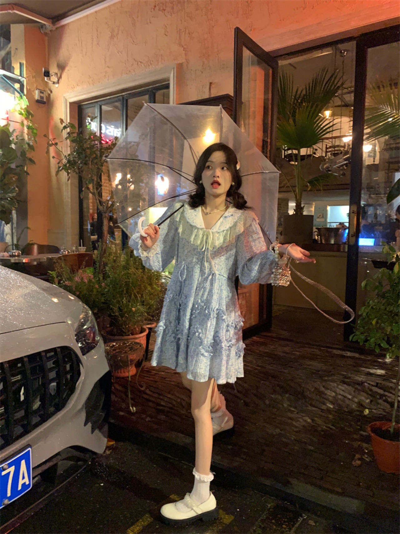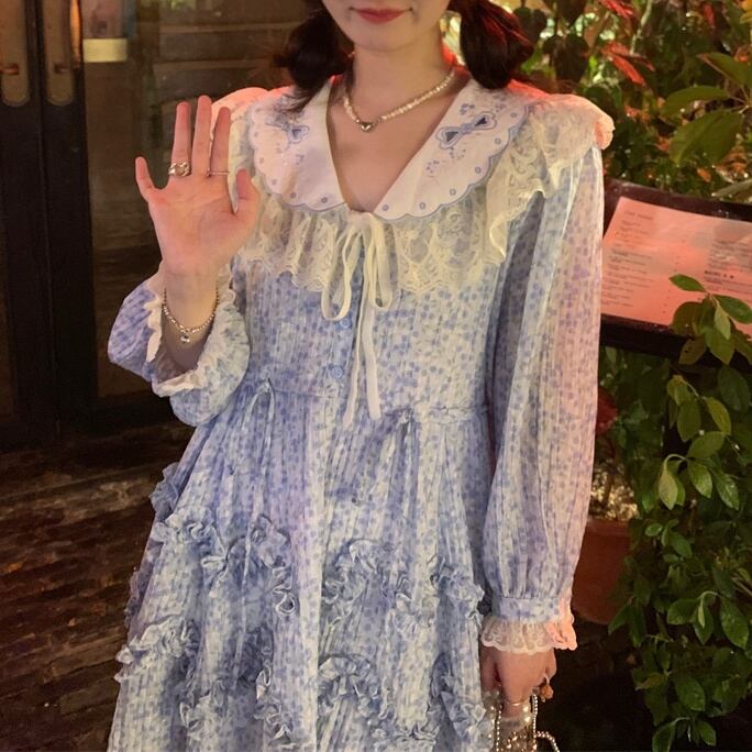 ワンピース 花柄 セーラー襟 量産 姫系 ロリータ 長袖 レディース フリル リボン ビッグカラー 春 秋 冬 Aライン Vネック ふんわり ガーリー フェミニン カジュアル ゆったり オシャレ お洒落 かわいい 大人可愛い 10代 20代 30代 茶色 ブラウン ブルー 青 水色 総柄 華奢 韓国 トレンド 流行 映え SNS 女子会 モテ デート スタイルアップ S М L スカラップ 小花 フラワー 刺繍 ギャザー ミニ丈 ショート丈 膝上 お出かけ ショッピング 参戦服 コンサート ライブ お茶会