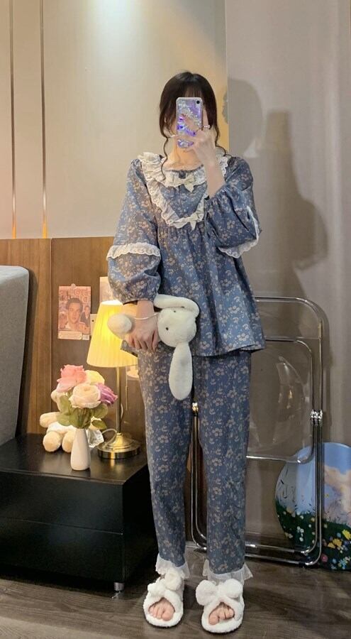 パジャマ 上下セット 花柄 フリル リボン レディース 長袖 長ズボン ゆったり 2点セット ラウンドネック シンプル カジュアル 春 夏 秋 冬 オールシーズン ルームウェア 部屋着 リラックス ブルー 青 水色 総柄 小花 フラワー オシャレ お洒落 かわいい 大人可愛い 10代 20代 30代 40代 お泊り 女子会 旅行 映え SNS トレンド 韓国 流行 モテ ゆる プレゼント ギフト 薄手 ウエストゴム 楽ちん 快適 ガーリー ロリータ 姫系 量産 フェミニン フェアリー 新作 2022