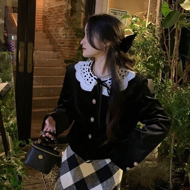 アウター ジャケット 襟付き リボン バイカラー レディース ショート丈 ゆったり 長袖 きれいめ エレガント 上品 清楚 黒 ブラック 白 ホワイト シンプル カジュアル 体型カバー 細見え 着痩せ 秋 冬 春 かわいい 大人可愛い オシャレ お洒落 ОL 通勤 デート モテ 女子会 量産 姫系 ロリータ こなれ感 休日 お出かけ ショッピング 10代 20代 30代 40代 前開き Iライン ストレート スタイルアップ 脚長 高級感 レース スカラップ デザイン ボタン S М L