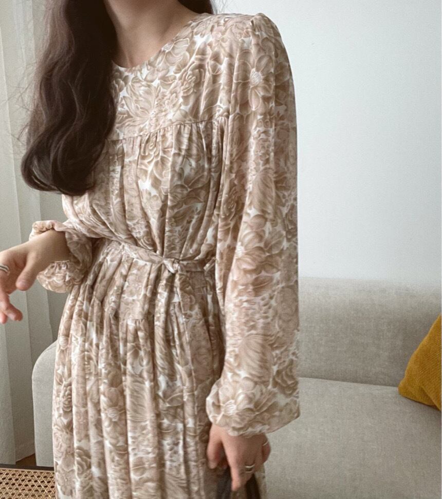ワンピース レディース ロング丈 長袖 パフスリーブ クルーネック ティアード フレア シフォン かわいい 大人可愛い 大人 上品 おしゃれ お洒落 レトロ 大人女子 ゆったり ゆる 存在感 とろみ感 ワンサイズ フリーサイズ サーモンピンク グレージュ オレンジ ベージュ 花柄 バラ 春 秋 10代 20代 30代 40代 デート お出かけ 女子会 休日 イベント リゾート 旅行 海 プール 体型カバー プレゼント ギフト 韓国 オルチャン 楽ちん