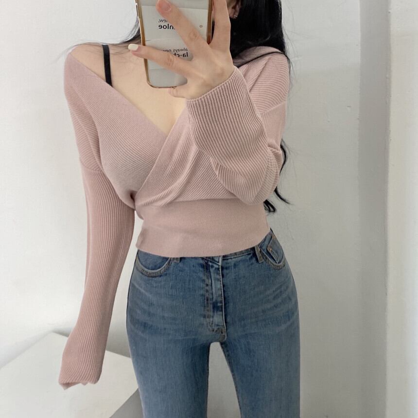トップス ニット 4色 ニットソー カットソー Vネック クロスデザイン 長袖 レディース タイト スリム 細身 シンプル カジュアル ラフ 無地 ベージュ 黒 ブラック ピンク ブルー 青 水色 くすみカラー ショッピング 10代 20代 30代 40代 50代 春 秋 冬 お洒落 オシャレ かわいい 大人可愛い こなれ感 伸縮性 あったか 暖かい 着心地 薄手 柔らか 着回し セーター 萌え袖 女子会 デート モテ エレガント 上品 きれいめ 高級感 高見え 韓国 トレンド 薄手 ドロップショルダー