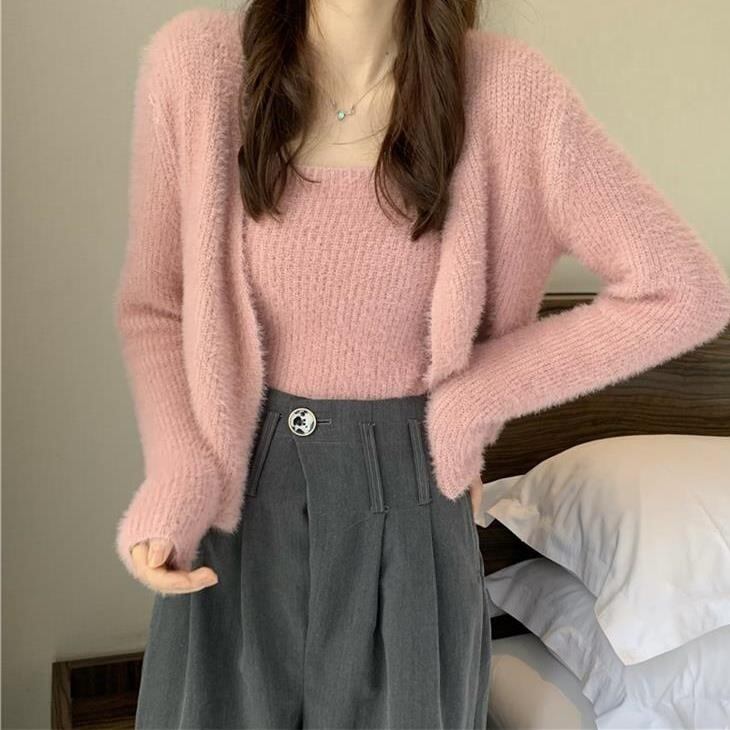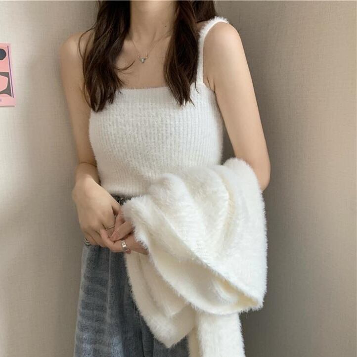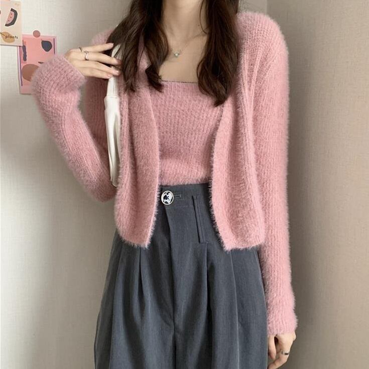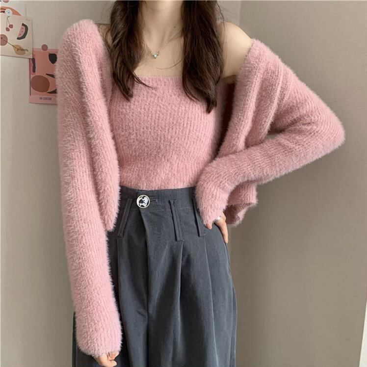 トップス カーディガン ファー 2点セット 4色 ふわふわ レディース ゆったり 大きめ 長袖 きれいめ 水色 ブルー ピンク ホワイト 白 黒 ブラック シンプル カジュアル 体型カバー 細見え 着痩せ 秋 冬 春 かわいい 大人可愛い オシャレ お洒落 デート モテ 女子会 ゆる こなれ感 休日 お出かけ ショッピング 10代 20代 30代 40代 前開き ルーズ ゆる 量産型 韓国 トレンド 流行 Vネック 手触り 着心地 学生 お得 お買い得 キャミソール チューブトップ ニット モヘア