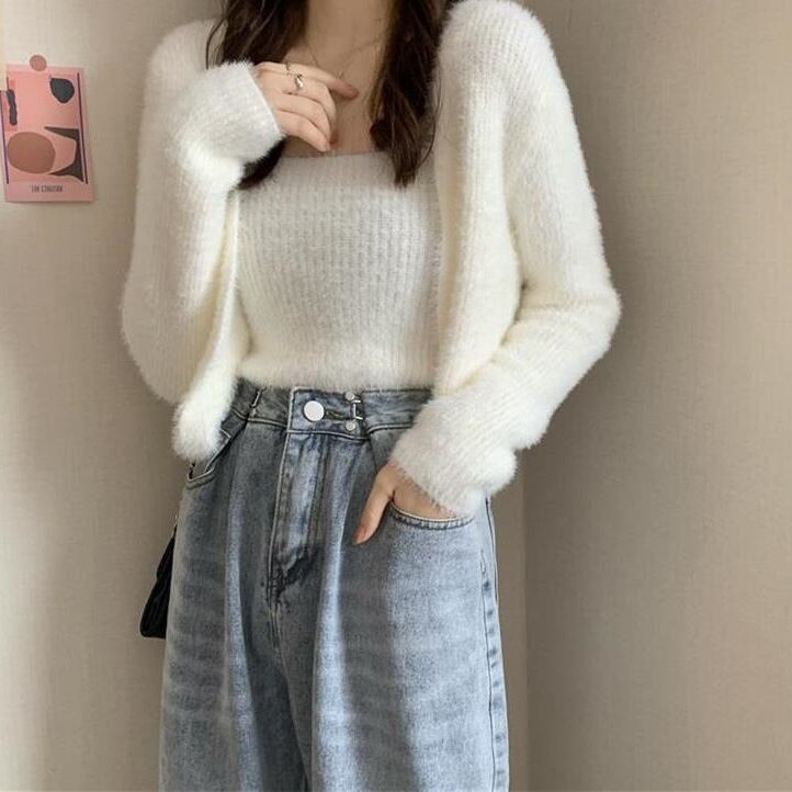 ふわふわ素材のカーディガンとキャミソールのセットです。