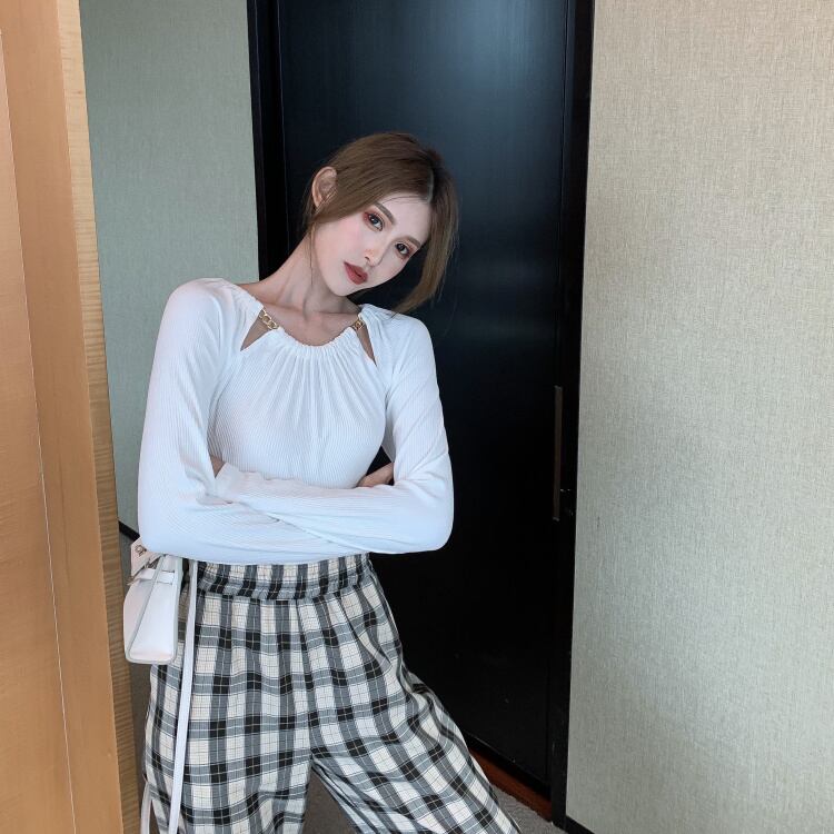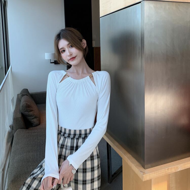トップス シャツ カットソー チェーン スリット 長袖 レディース きれいめ エレガント タイト スリム 細身 S М L お洒落 オシャレ かわいい 大人可愛い 10代 20代 30代 40代 シンプル カジュアル 春 秋 冬 こなれ感 休日 お出かけ 買い物 公園 女子会 モテ デート 着回し 薄手 抜け感 ホワイト 白 黒 ブラック 無地 個性派 個性的 ラフ こなれ感 ラウンドネック セクシー 鎖骨 デコルテ 小顔 華奢 スタイルアップ 映え SNS ギャザー 個性的 存在感