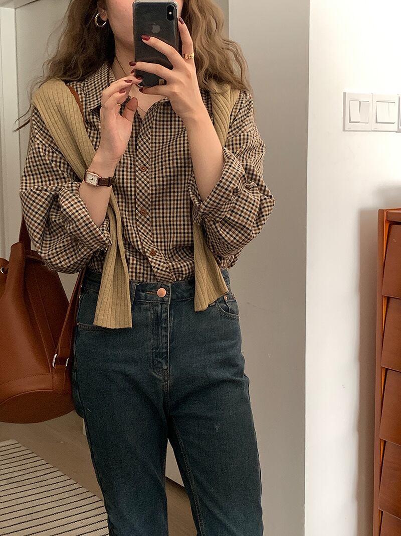トップス ブラウス シャツ チェック柄 襟付き 長袖 ゆったり レディース きれいめ 上品 エレガント お洒落 オシャレ かわいい 大人可愛い 10代 20代 30代 40代 50代 ОL 通勤 仕事 オフィス 学生 シンプル カジュアル 春 秋 夏 冬 こなれ感 休日 お出かけ 女子会 韓国 トレンド 流行 Iライン ストレート 柔らか 着心地 総柄 ブラウン 茶色 くすみカラー 抜け感 知的 美人 清潔感 清楚 着回し 前開き ボタン 体型カバー S М L XL レトロ アンティーク ヴィンテージ