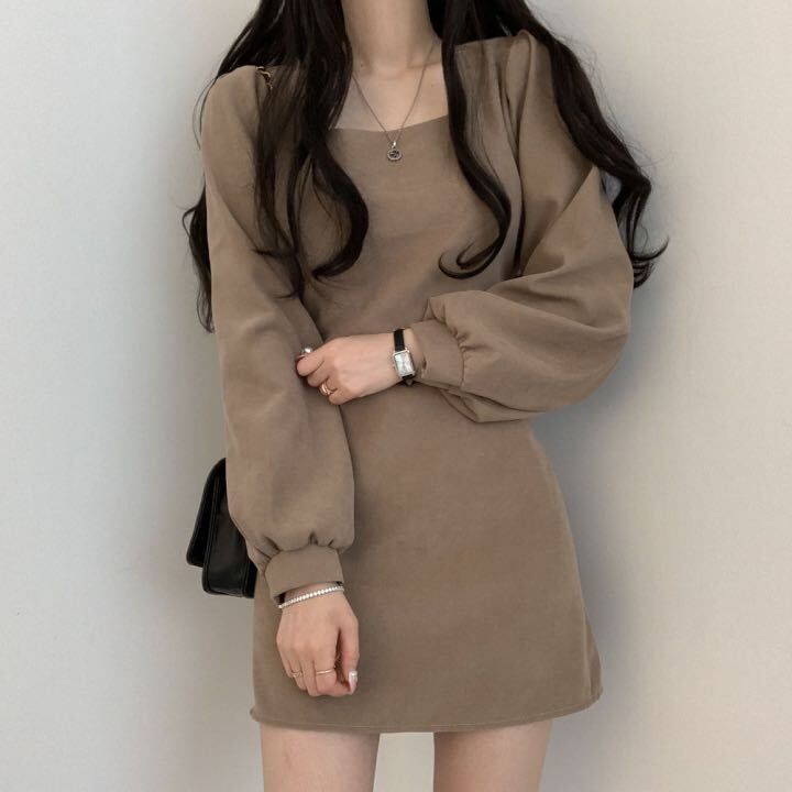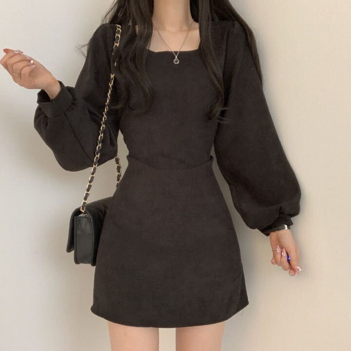 ワンピース ミニ丈 ランタンスリーブ レディース 長袖 ハイウエスト ショート丈 Aライン スクエアネック 無地 シンプル カジュアル 薄手 春 秋 冬 かわいい 大人可愛い 大人女子 ガーリー ふんわり ぽわん オシャレ お洒落 着回し 重ね着 10代 20代 30代 40代 韓国 トレンド 脚長 流行 美脚 ギャザー S М L XL 無地 黒 ブラック ベージュ デート モテ 女子会 お出かけ 買い物 普段着 映え SNS 双子 お揃い コーデ 色違い ギャザー タイト スリム 細身 デコルテ 華奢