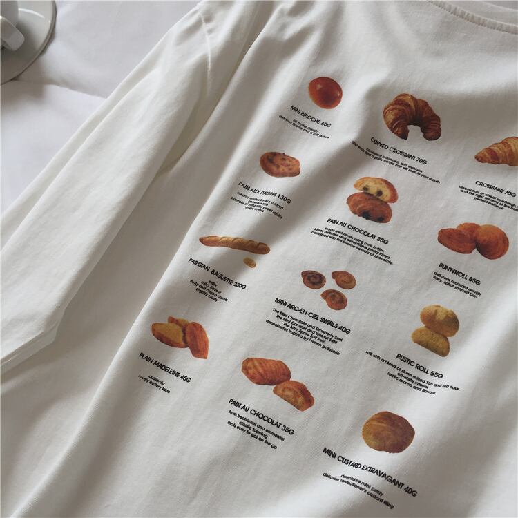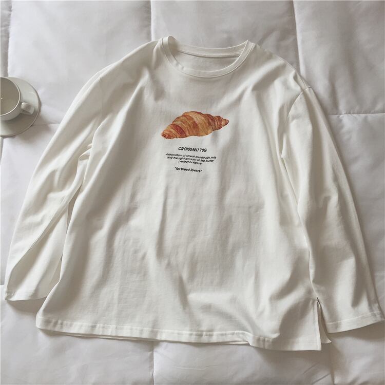 トップス レディース 白トップス ロンT 長袖Tシャツ 襟なし ラウンドネック クルーネック クロワッサンプリント イラスト 英字 パン ブレッド かわいい シンプル カジュアル おしゃれ お洒落 かっこいい レトロ こなれ感 ラフ ルーズ キュート 個性的 存在感 抜け感 ワンサイズ フリーサイズ 白 ホワイト 黒 ブラック 春 夏 秋 10代 20代 30代 40代 50代 学生 通学 お泊り 休日 イベント 旅行 プレゼント ギフト 定番 着回し 普段使い 重ね着 韓国 オルチャン 楽ちん