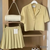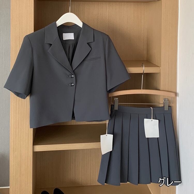 セットアップ 3色 上下セット ジャケット ミニスカート レディース スーツ 2点セット プリーツ ミニ丈 半袖 ショート丈 オシャレ お洒落 かわいい 大人可愛い エレガント 高級感 存在感 きれいめ 韓国 トレンド 流行 ハイウエスト 脚長 美脚 スタイルアップ S М 無地 イエロー 黄色 グリーン 緑 グレー 灰色 くすみカラー ポケット ゆったり Iライン ストレート 新作 2022 お得 お買い得 春 夏 秋 冬 女子会 デート モテ お呼ばれ ショッピング パーティー