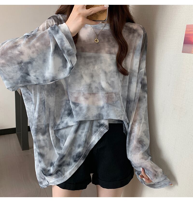 トップス Tシャツ タイダイ オーバーサイズ 透け感 シアー レディース ラウンドネック 長袖 ゆったり 大きめ シンプル カジュアル ラフ ルーズ こなれ感 お洒落 オシャレ かわいい 大人可愛い ドロップショルダー 10代 20代 30代 40代 体型カバー 着痩せ 細見え 膝上 ロング丈 春 夏 韓国 トレンド クール 個性的 個性派 重ね着 着回し 休日 お出かけ ショッピング 買い物 部屋着 ルームウェア 普段着 映え SNS ブルー 水色 グレー 灰色 セクシー シースルー