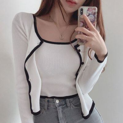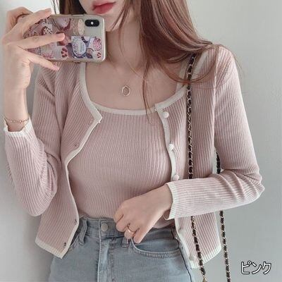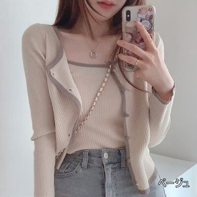 トップス 2点セット カーディガン キャミソール 6色 バイカラー ニット レディース タイト スリム 長袖 きれいめ 上品 エレガント 清楚 ホワイト 白 ピンク グリーン 緑 グレー 灰色 ベージュ 黒 ブラック シンプル カジュアル 着痩せ 秋 冬 春 かわいい 大人可愛い オシャレ お洒落 デート モテ 女子会 ゆる こなれ感 休日 お出かけ ショッピング 10代 20代 30代 40代 前開き 韓国 トレンド 流行 ラウンドネック 着心地 学生 お得 お買い得 チューブトップ S М L