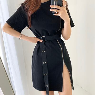 ワンピース スリット ベルト付き レディース ハイウエスト ファスナー 半袖 ミニ丈 ショート丈 タイト スリム トレンド 流行 韓国 ラウンドネック 黒 サイドスリット 美脚 脚長 ウエスト くびれ 体型カバーオシャレ お洒落 個性派 個性的 エレガント ヴィンテージ アンティーク レトロ シック モダン10代 20代 30代 女子会 デート 映え SNS 春 夏 秋 かわいい 大人可愛い セクシー S М L 個性的 個性派 ロック パンク ゴシック 主役 存在感