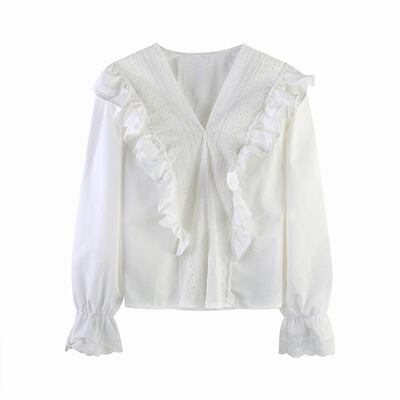 トップス ブラウス フリル レース カットソー 長袖 レディース ボリューム ふんわり きれいめ 上品 清楚 清潔感 エレガント 高級感 お洒落 オシャレ フェミニン ガーリー フェアリー かわいい 大人可愛い 10代 20代 30代 40代 ОL 通勤 シンプル カジュアル 春 夏 秋 冬 オールシーズン こなれ感 女子会 デート モテ 韓国 トレンド 流行 白 ホワイト 無地 薄手 映え SNS 繊細 S М L XL 2XL Vネック 新作 2023 韓国 量産 姫系 ロリータ デコルテ 小顔 鎖骨