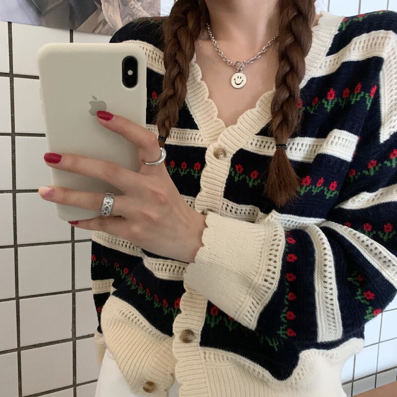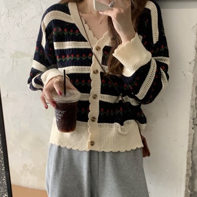 トップス ニット カーディガン 花柄 スカラップ 長袖 レディース ゆったり 前開き 小花 フラワー ボタン シンプル カジュアル ラフ ストライプ ボーダー ベージュ 黒 ブラック くすみカラー ルーズ ゆる リラックス 休日 お出かけ 公園 体型カバー 着痩せ 細見え 20代 30代 40代 50代 60代 春 秋 冬 お洒落 オシャレ かわいい 大人可愛い 映え SNS あったか 暖かい Vネック 抜け感 こなれ感 レトロ アンティーク ヴィンテージ 薄手 鎖骨 デコルテ 華奢