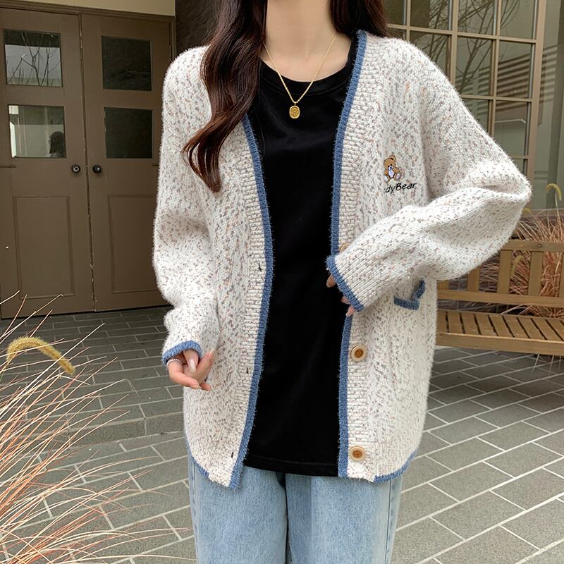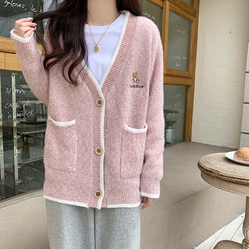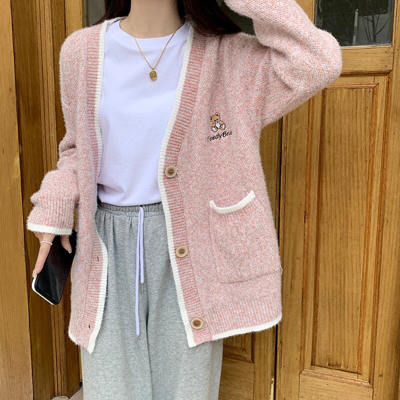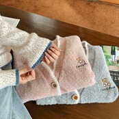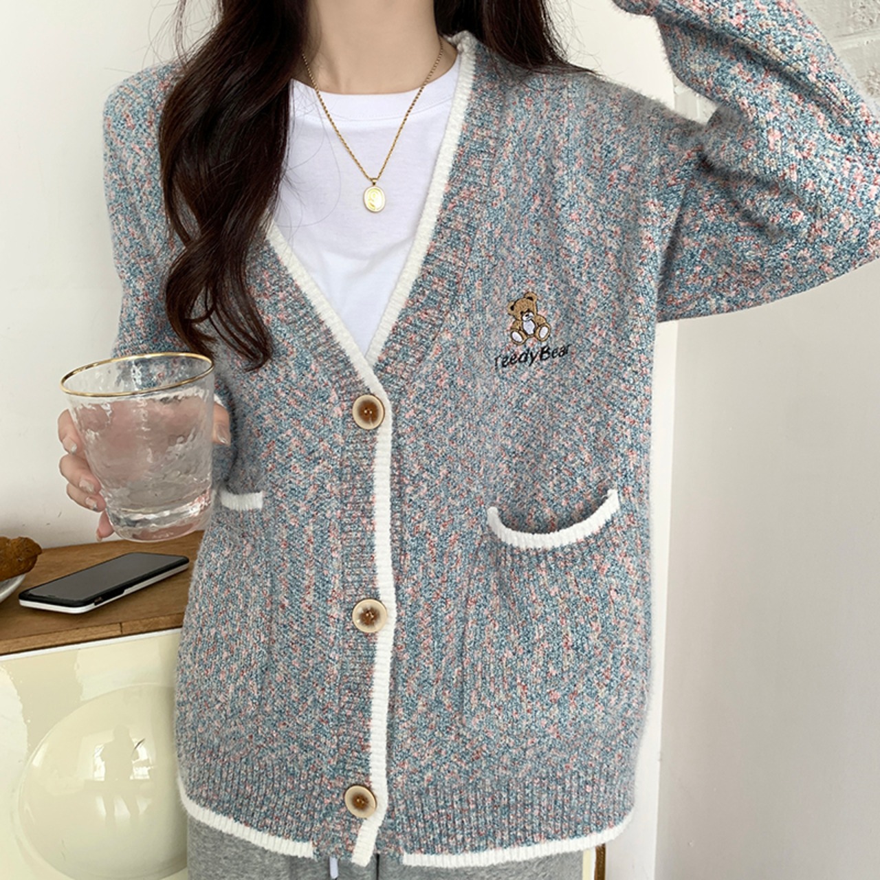 トップス ニット カーディガン 3色 くまちゃん 刺繍 長袖 レディース ゆったり シンプル カジュアル ラフ カラフル ベージュ ピンク ブルー 水色 グレー パステルカラー くすみカラー ルーズ ゆる 休日 お出かけ ショッピング 体型カバー 着痩せ 細見え 10代 20代 30代 40代 春 秋 冬 お洒落 オシャレ かわいい 大人可愛い 色違い 映え SNS 新作 2023 あったか 暖かい Vネック 抜け感 こなれ感 テディベア クマ 学生 スクール 制服 女子会 デート