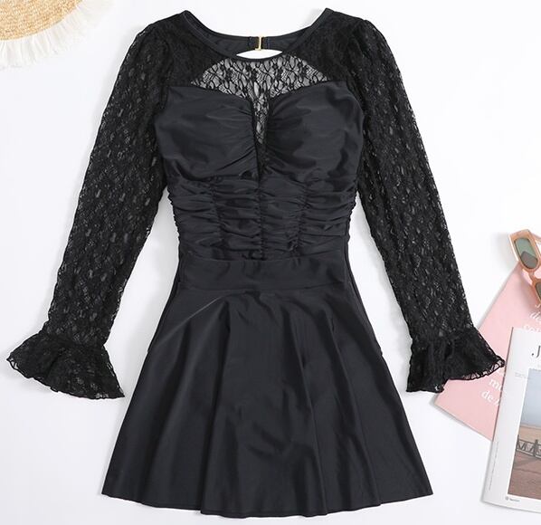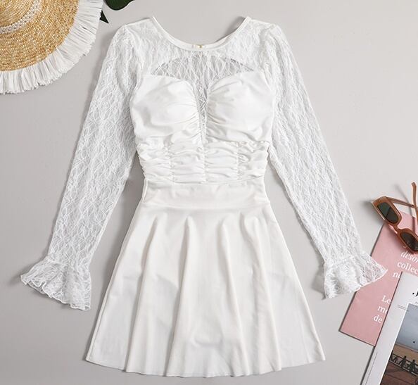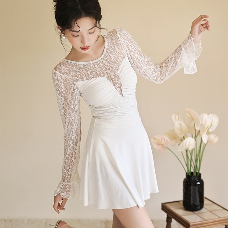 水着 2点セット ワンピース 2色 長袖 フリル レース レディース 透け感 スカート 韓国 トレンド 流行 シアー 肌見せ 学生 ОL スクール 海 海水浴 ビーチスイミング 白 ホワイト ブラック 黒 10代 20代 30代 40代 かわいい 大人可愛い 大人女子 オシャレ お洒落 セクシー キュート ガーリー フェミニン フェアリー 量産 ロリータ 姫系 大きいサイズ М L XL 個性的 個性派 ハイウエスト 脚長 美脚 スタイルアップ 新作 2023 映え SNS Aライン カップ付き
