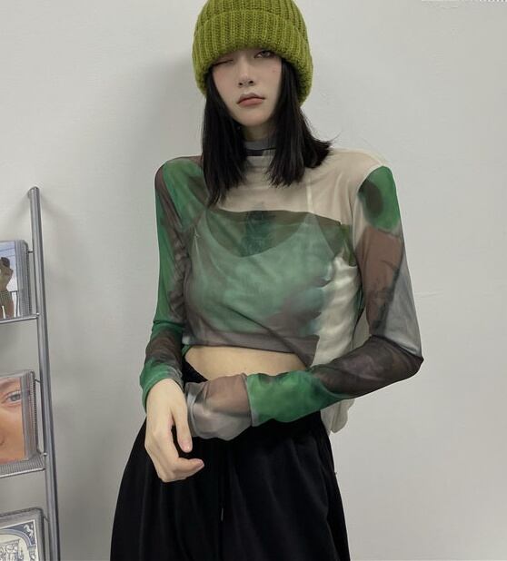 トップス シャツ カットソー ハイネック 長袖 レディース 薄手 透け感 シアー タイト ゆったり 大きめ シンプル カジュアル ラフ 総柄 緑 グリーン ホワイト 白 迷彩 くすみカラー 10代 20代 30代 40代 春 秋 夏 お洒落 オシャレ かわいい 大人可愛い こなれ感 伸縮性 着心地 柔らか 着回し 重ね着 女子会 新作 2021 華奢 スタイルアップ メンズライク クール かっこいい サブカル