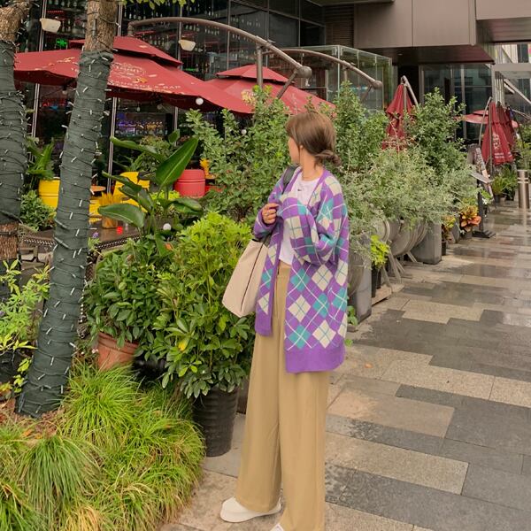 トップス カーディガン ニット アーガイル レディース もこもこ ふわふわ Vネック 長袖 ロング丈 オシャレ お洒落 かわいい 大人可愛い ガーリー 個性的 10代 20代 30代 40代 50代 着回し 重ね着 シンプル カジュアル ラフ 総柄 紫 パープル 華奢 細見え 春 秋 冬 抜け感 こなれ感 レトロ アンティーク ヴィンテージ 柔らか 着心地 学生 チェック柄 シック モダン くすみカラー 新作 2022 ゆったり 大きめ ドロップショルダー 派手 存在感 映え SNS