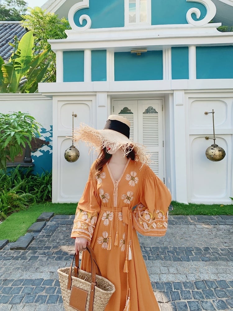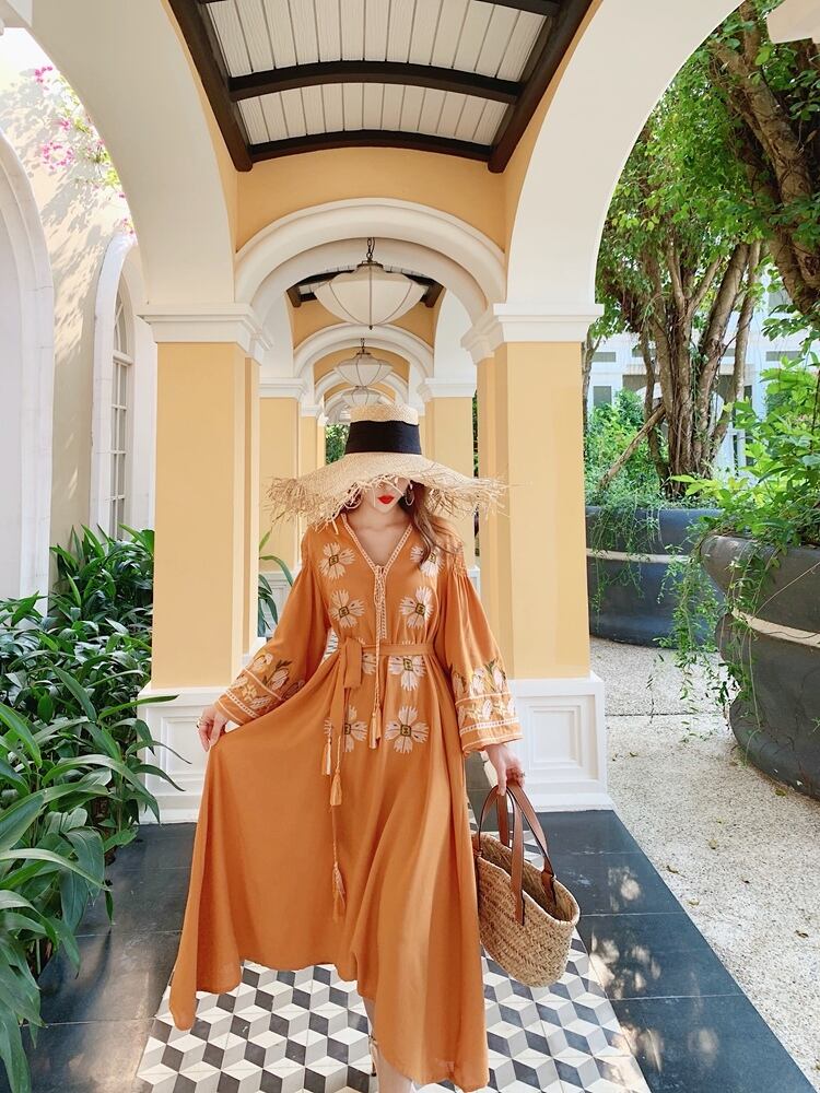 ワンピース ロング丈 長袖 刺繍 フリンジ レディース エスニック レトロ アジアン エキゾチック リゾート ボヘミアン ゆったり 大きめ ワイド S М L Aライン 花柄 フラワー マキシワンピース ロングワンピ ラオレンジ 派手 華やか オシャレ お洒落 かわいい 大人可愛い 個性的 個性派 こなれ感 ゆる 春 夏 秋 20代 30代 40代 50代 旅行 デート 女子会 お出かけ 映え SNS Vネック アシンメトリー 海 ビーチ