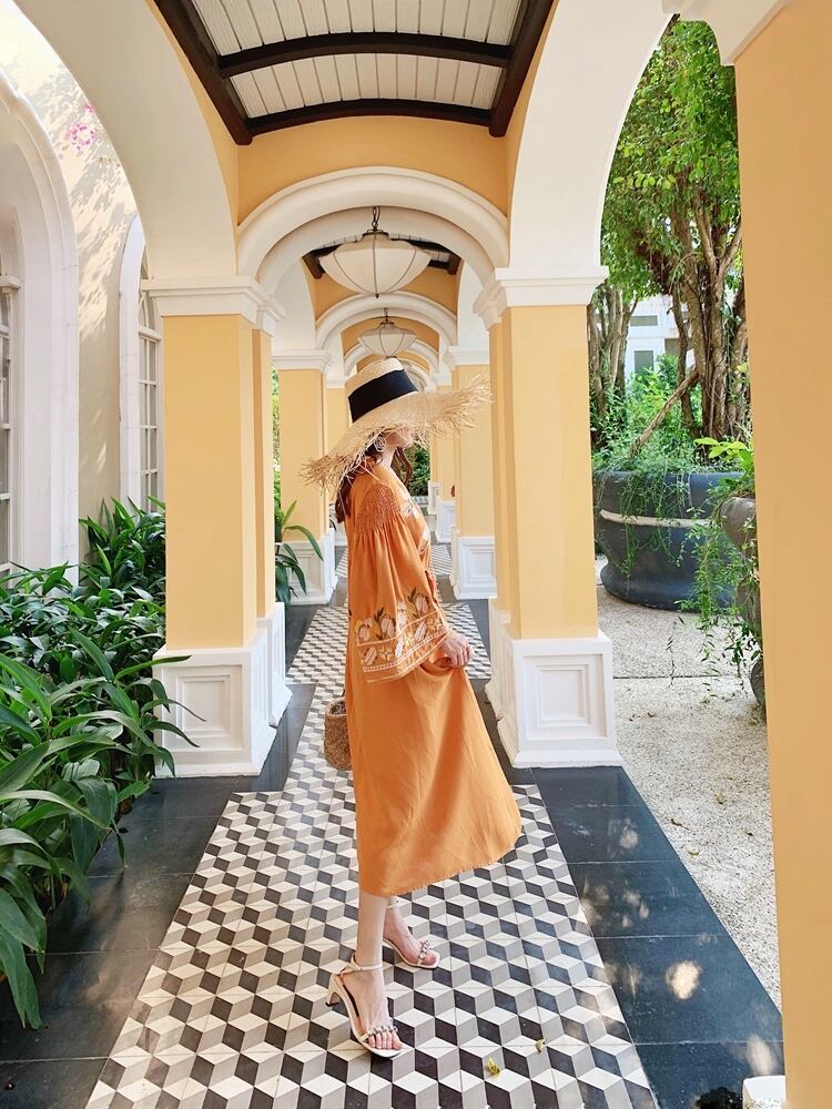 華やかなオレンジ色が目を引くワンピースです。